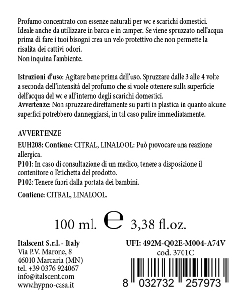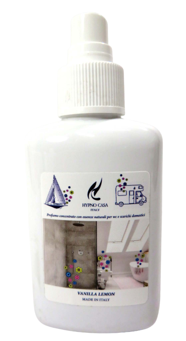 profumatore spray per wc, doccia, sanitari di camper e barche e ambienti con scorrimento di acqua sanitaria; giusto 2 spruzzate di essenza naturale Vanille e al primo risciacquo si espandera' nell'ambiente un gradevole fresco profumo persistente eliminando odori sgradevoli. Questo prodotto non inquina. La confezione è di 100ml.