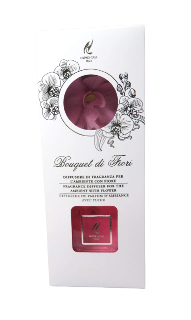 diffusore di fragranza per l'ambiente, contenitore in vetro con orchidea rossa in fibra di carta naturale ed artigianale dalla Tailandia. Il fiore assorbe il profumo FIOR DI MAGNOLIA, profumo con fragranza 'fiorita e legnosa' e lo diffonde nell'ambiente in modo persistente. Confezione regalo elegante, bianca con disegni e scritte in rilievo color argento. Contenuto del profumo 100ml. Linea Bouquet di fiori di Hypno Casa. Profumo fatto in Italia. DIMENSIONE 7X3,5XH9/13cm