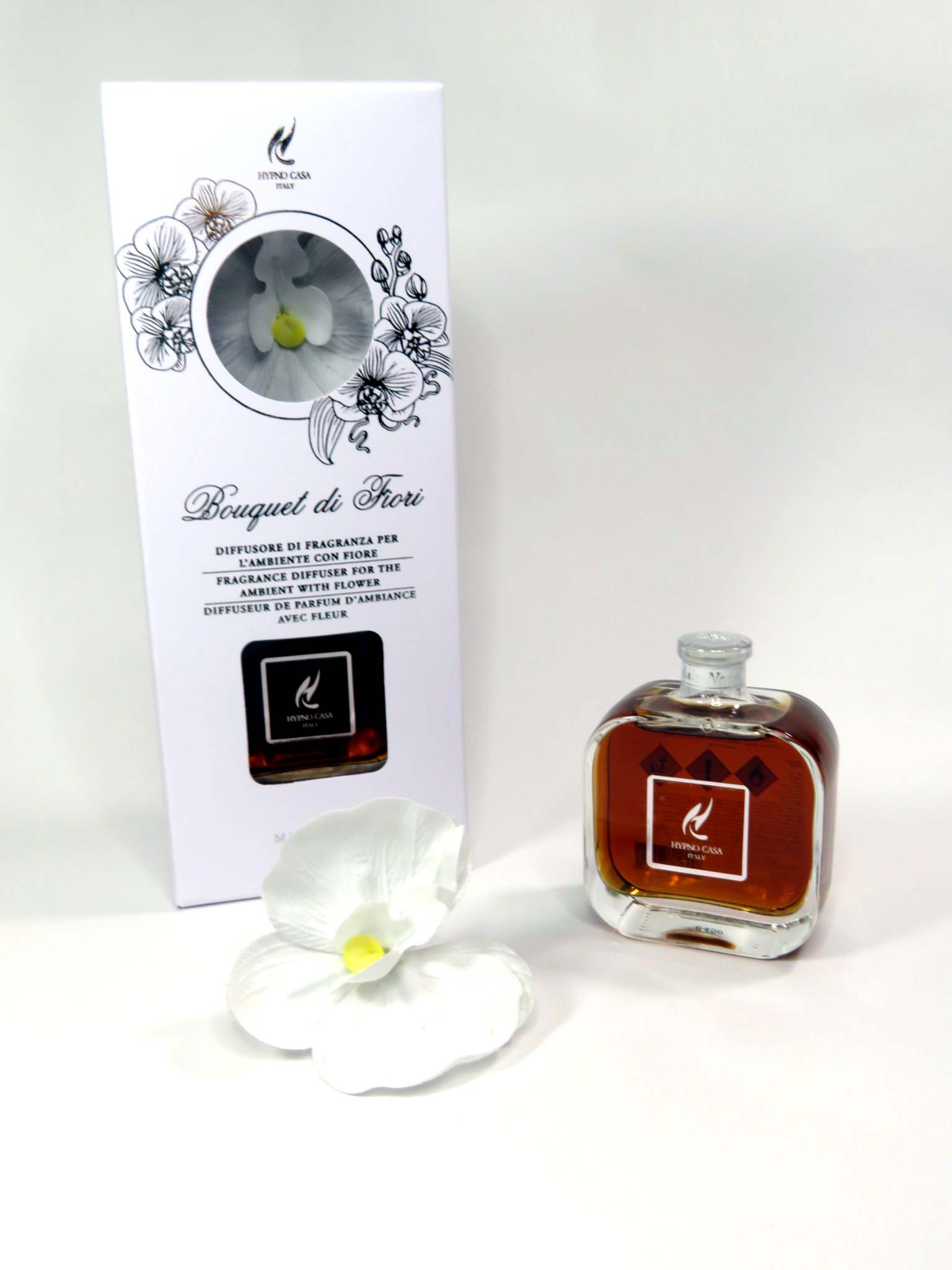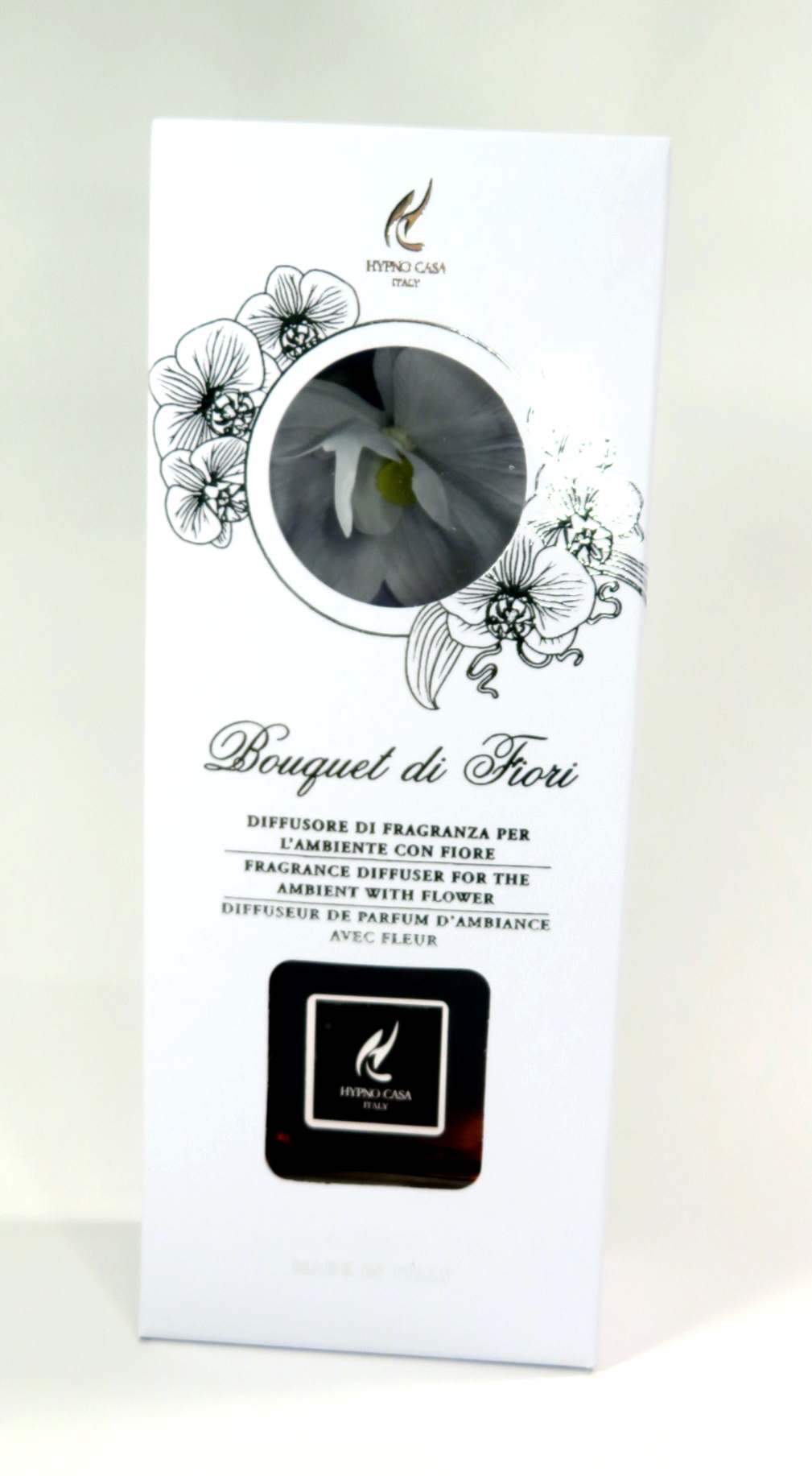 diffusore di fragranza per l'ambiente, contenitore in vetro con orchidea rossa in fibra di carta naturale ed artigianale dalla Tailandia. Il fiore assorbe il profumo SANDALO NOBILE, profumo con fragranza 'agrumata e legnosa' e lo diffonde nell'ambiente in modo persistente. Confezione regalo elegante, bianca con disegni e scritte in rilievo color argento. Contenuto del profumo 100ml. Linea Bouquet di fiori di Hypno Casa. Profumo fatto in Italia. DIMENSIONE 7X3,5XH9/13cm