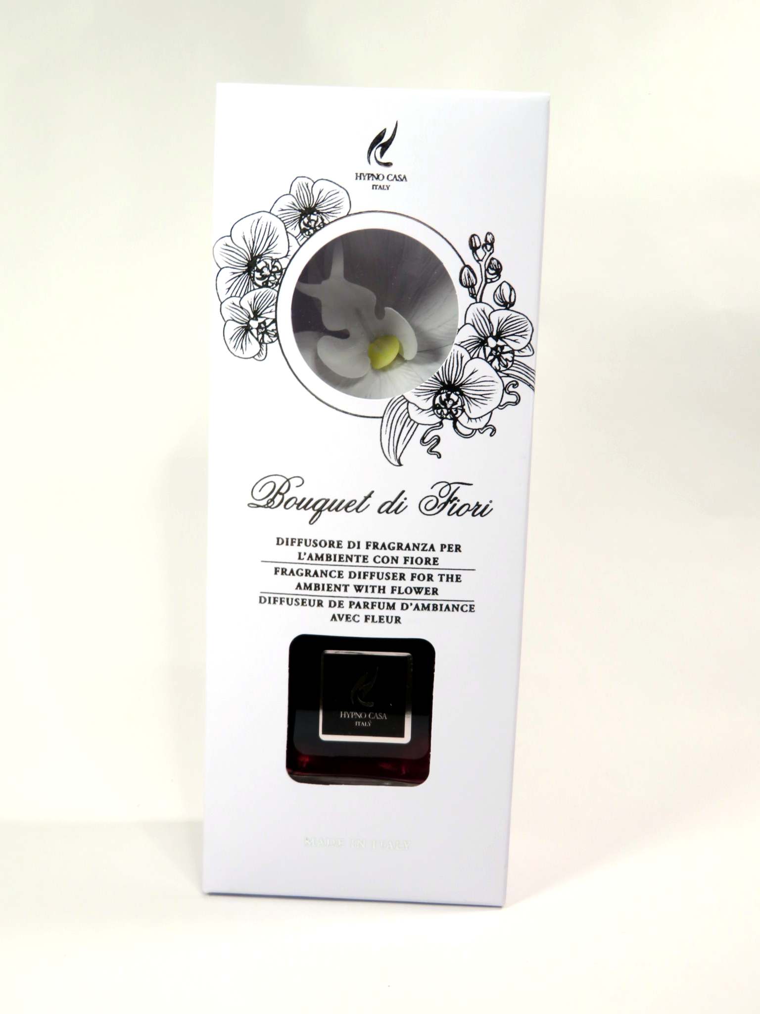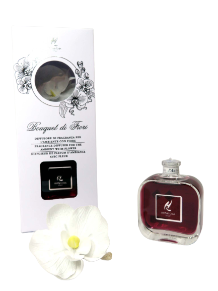 diffusore di fragranza per l'ambiente, contenitore in vetro con orchidea rossa in fibra di carta naturale ed artigianale dalla Tailandia. Il fiore assorbe il profumo MOSTO D'AUTUNNO, profumo con fragranza 'fruttata' e lo diffonde nell'ambiente in modo persistente. Confezione regalo elegante, bianca con disegni e scritte in rilievo color argento. Contenuto del profumo 100ml. Linea Bouquet di fiori di Hypno Casa. Profumo fatto in Italia. DIMENSIONE 7X3,5XH9/13cm