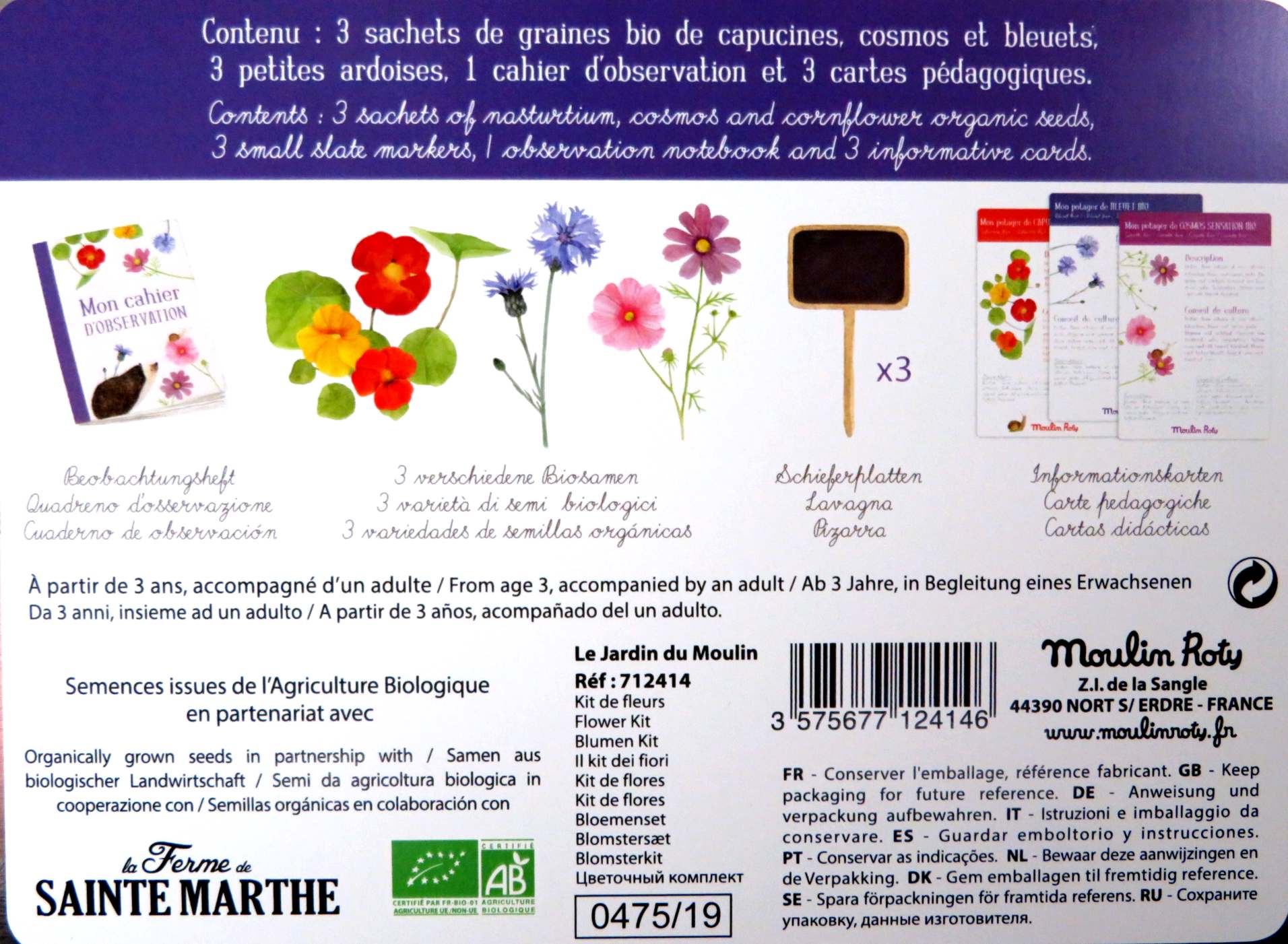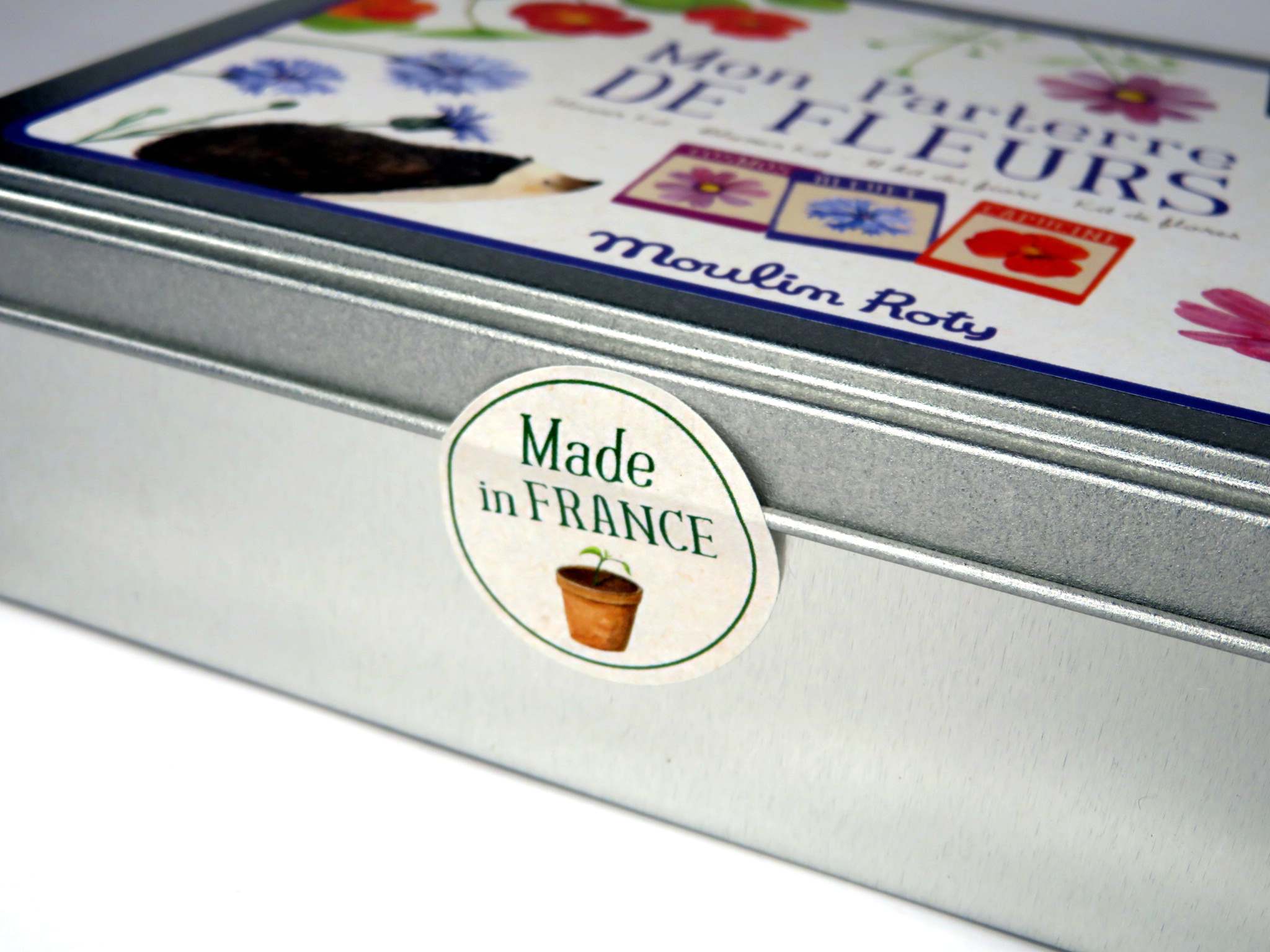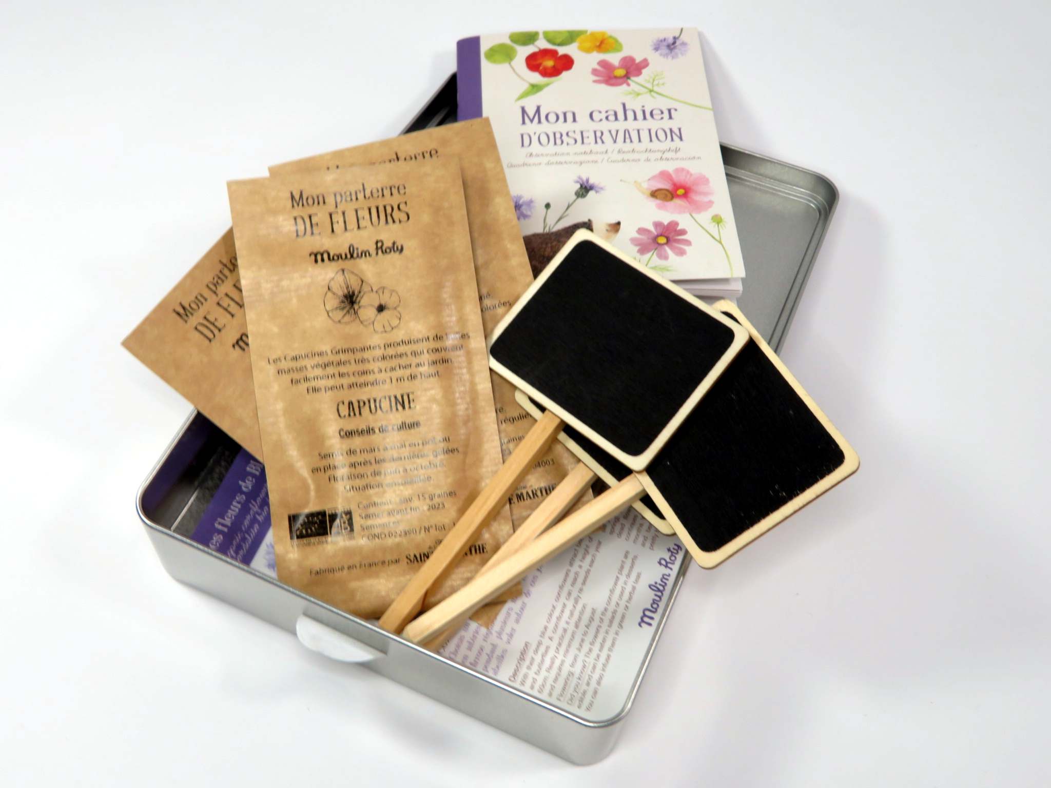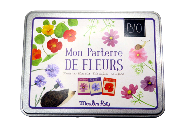 Kit coltivazione fiori del giardino, semi per coltivare fiordalisi, nasturzio e cosmos, consigli di coltivazione e tabelline lavagna per indicarne i nomi e il quaderno del perfetto coltivatore dove annotare i cambiamenti. Una scatola in latta contiene tutto. Adatto a bambini di età superiore a 3 anni.