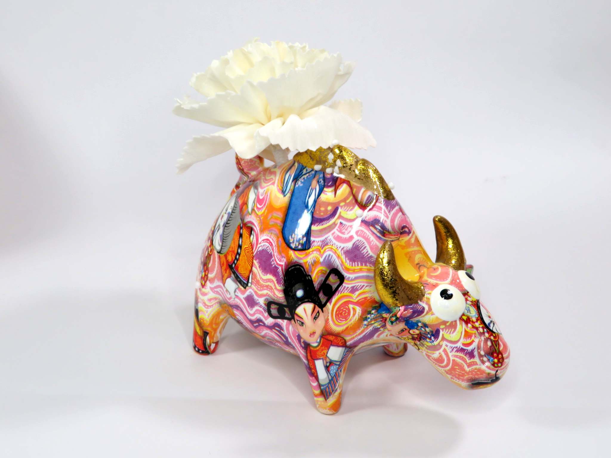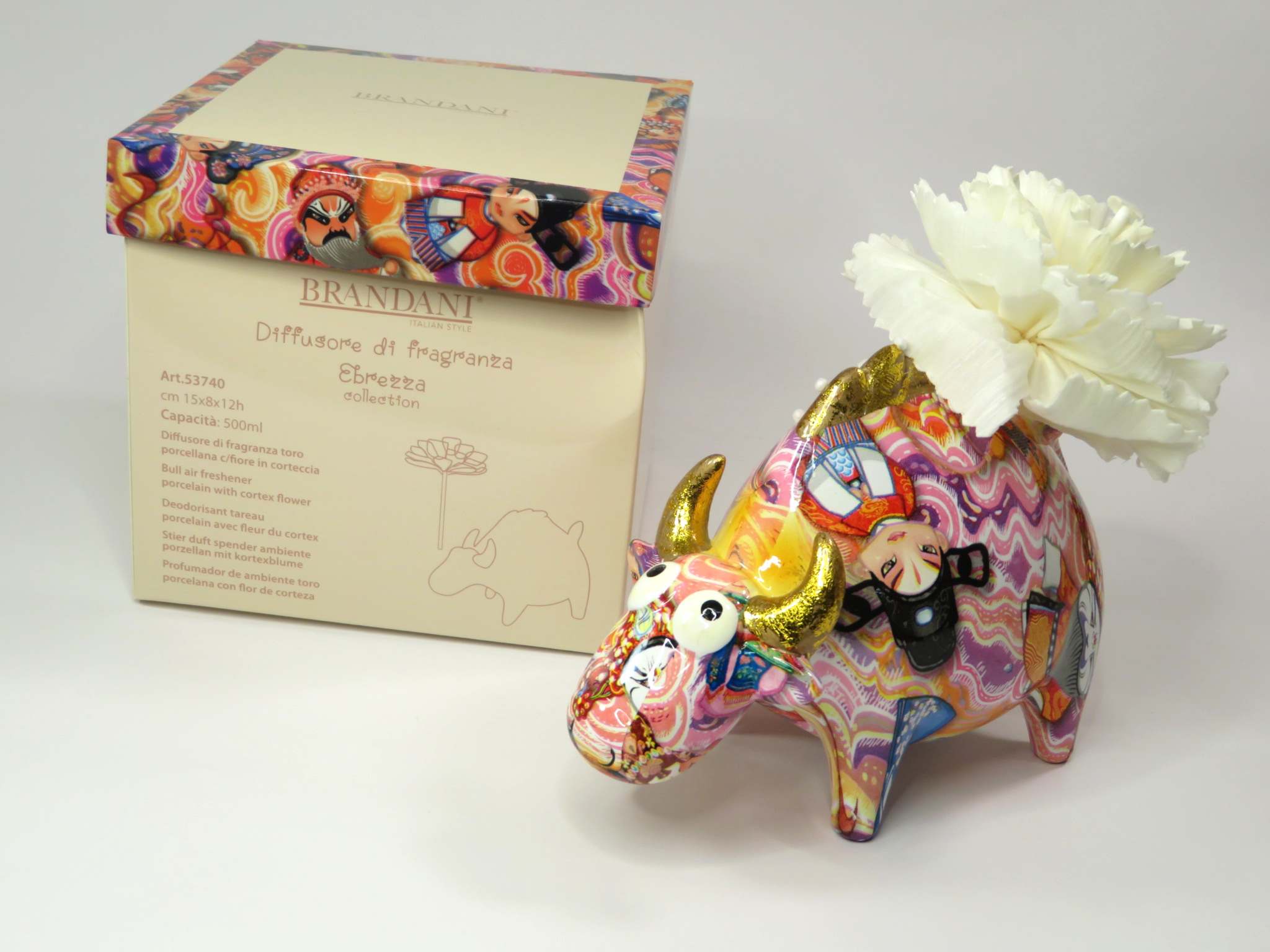 E a chi non piacerebbe un toro in casa? il simpatico toro diffonde per la casa il suo profumo (non incluso) attraverso il fiore di carta che si poggia sul suo dorso. 3 decori assortiti colorano questa collezione di oggetti in porcellana per donare allegria alla tua casa. DIMENSIONE: 15X8XH12cm