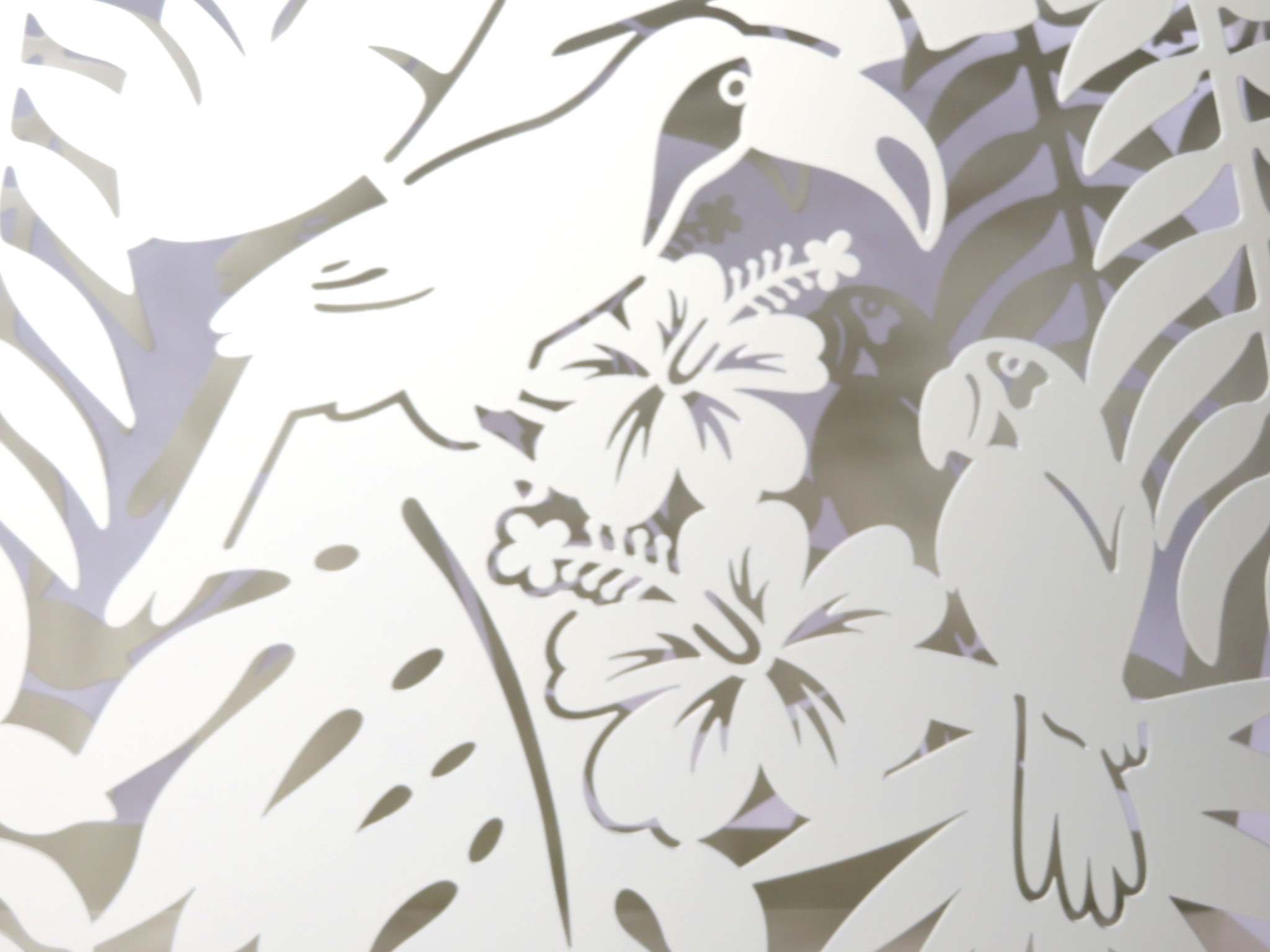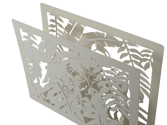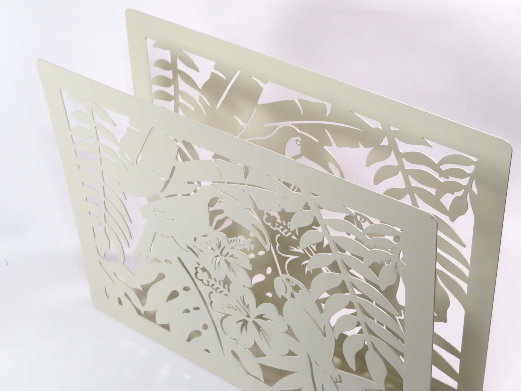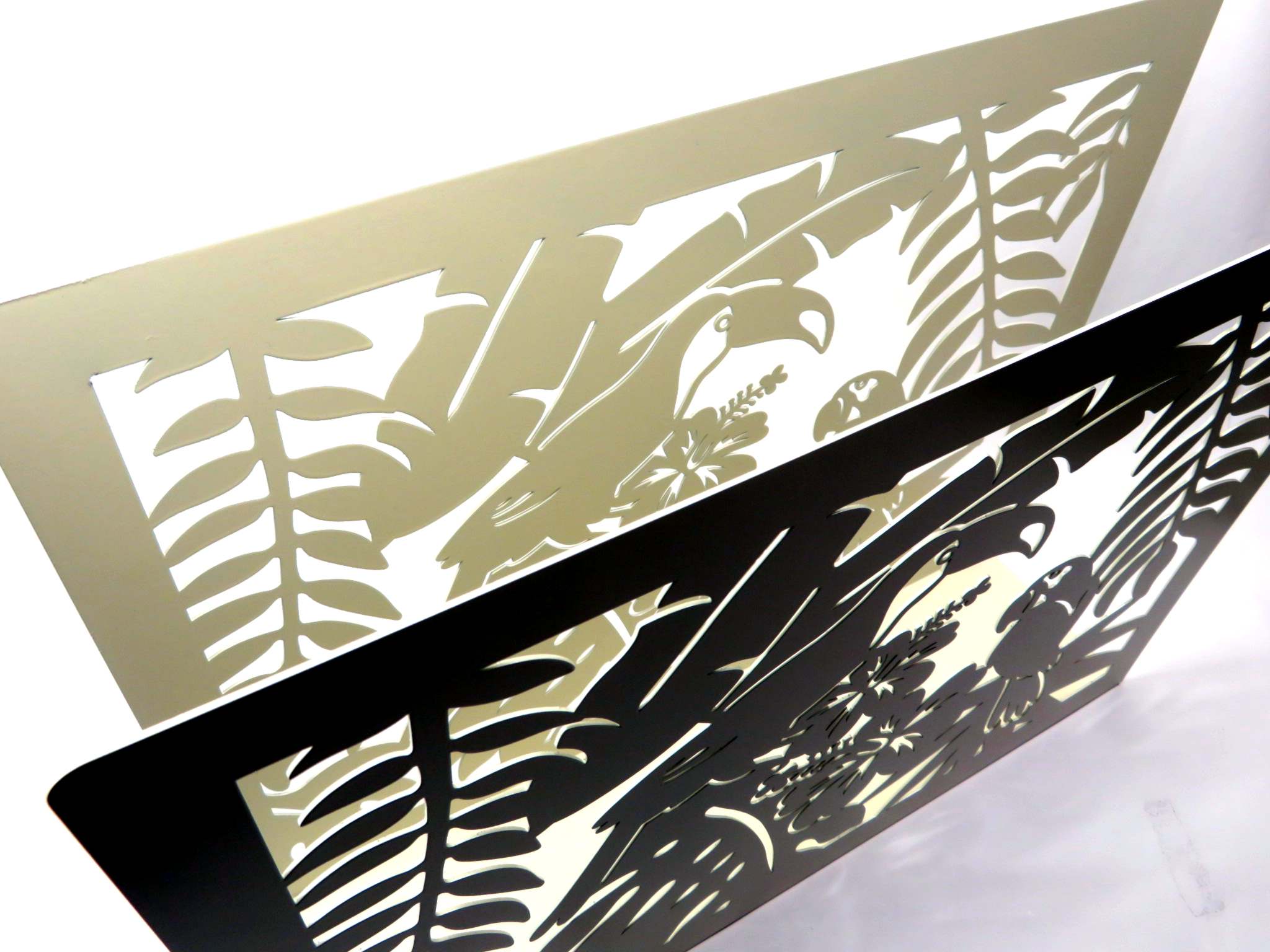 Porta riviste in metallo con decorazione a taglio laser tropicale, con uccelli tucano appoggiati sulle foglie della foresta e fiori. Il metallo è finemente lavorato, colorato bianco e adatto ad accogliere le riviste e arredare con eleganza il soggiorno di casa.