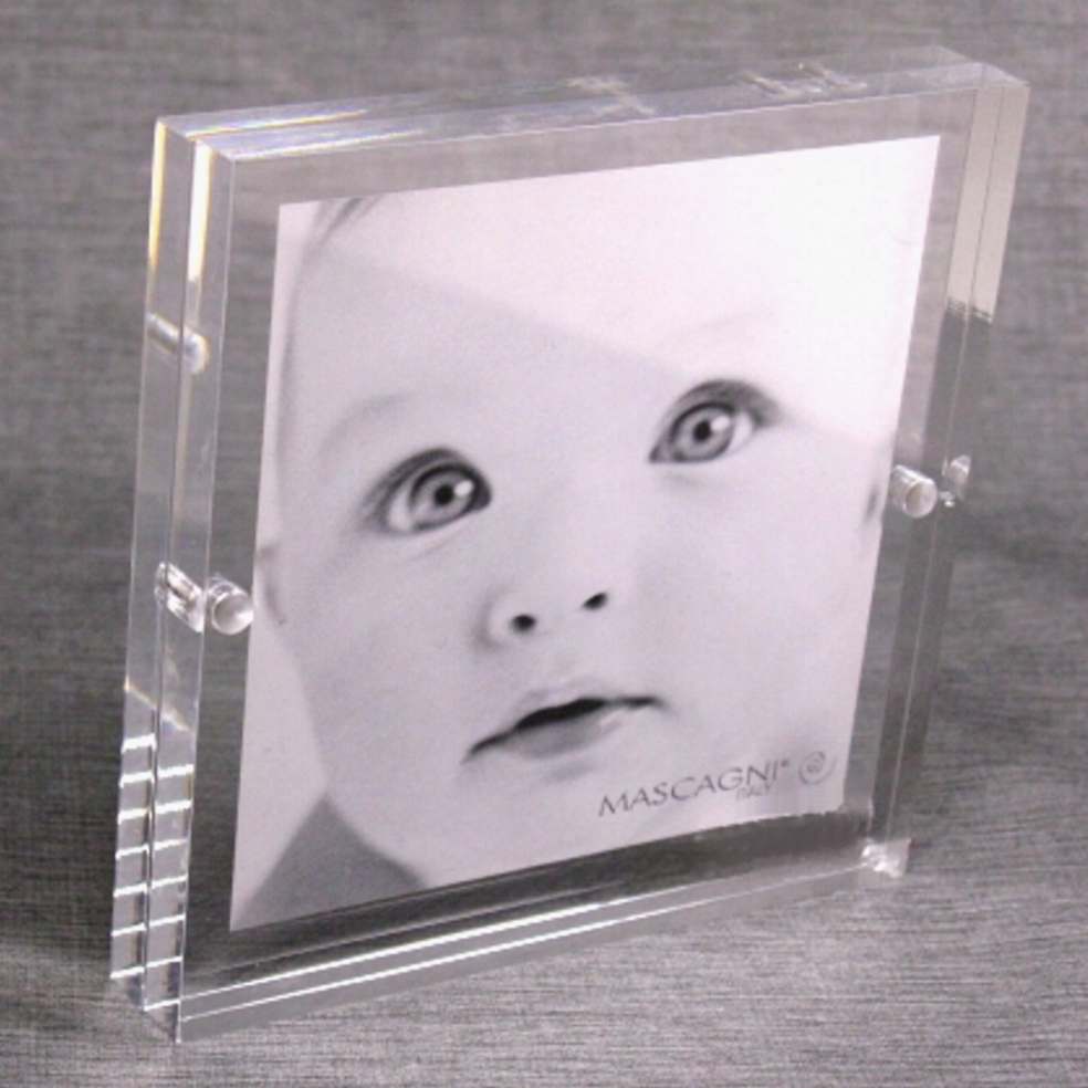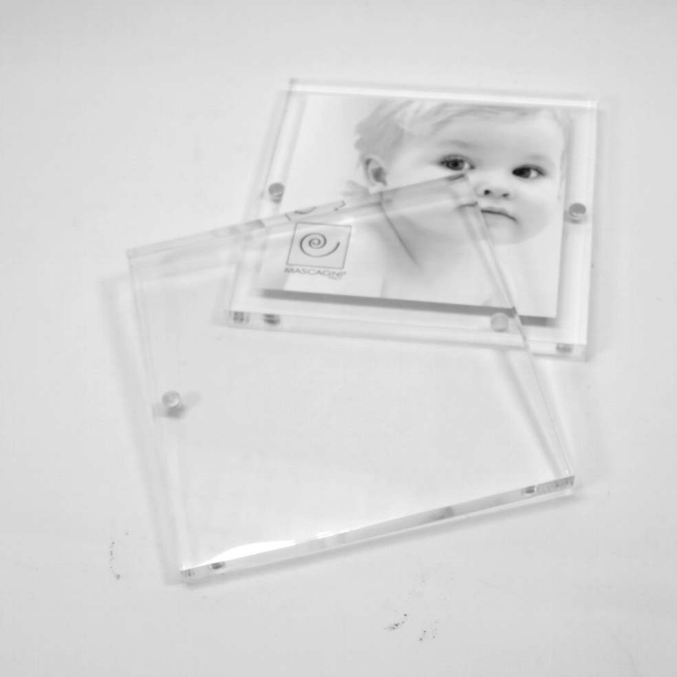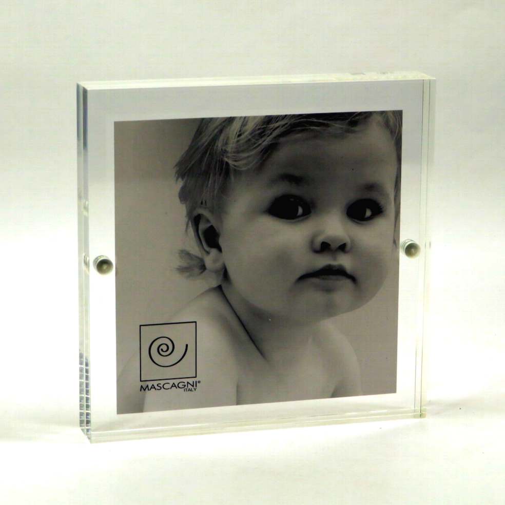 Cornice portafoto bifacciale completamente trasparente, senza cornice, magneti per fissare tra di loro le due pareti. La fotografia può occupare uno spazio o tutta la dimensione del portafoto, donando comunque la senszione di leggerezza. Possono essere posizionate anche 2 foto, una fronte e una retro oppure una foto davanti e una dedica sul posteriore. DIMENSIONE: 10X10CM