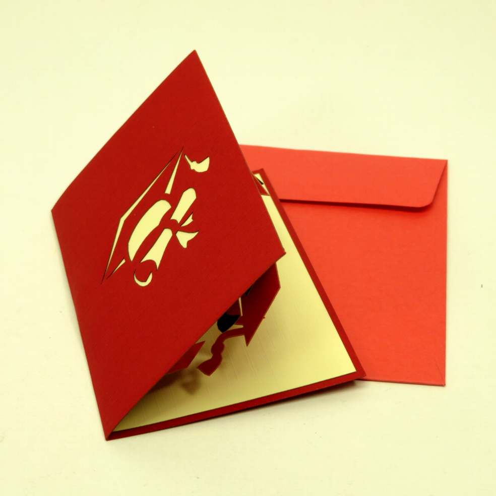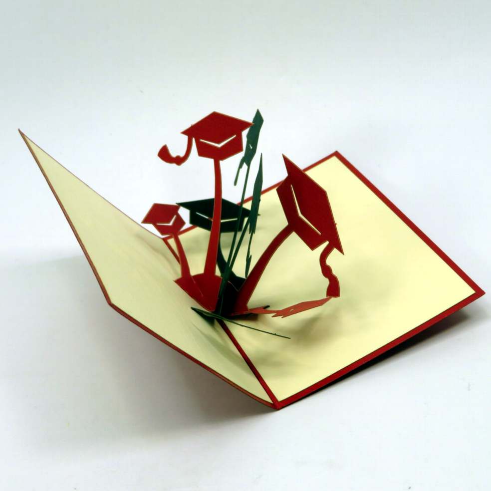 Biglietto augurale cappellini laurea rossi e neri, ideato da origamo Italia e costruito con maestria nei laboratori in Vietrnam dove il suo titolare sostiene progelle di solidarietà con la popolazione della fondazione Christina Noble. Il biglietto di Origamo regala emozioni, toccandolo con mano si puo notare la manualità nell'esecuzione. Dimensioni 9X6.5cm.