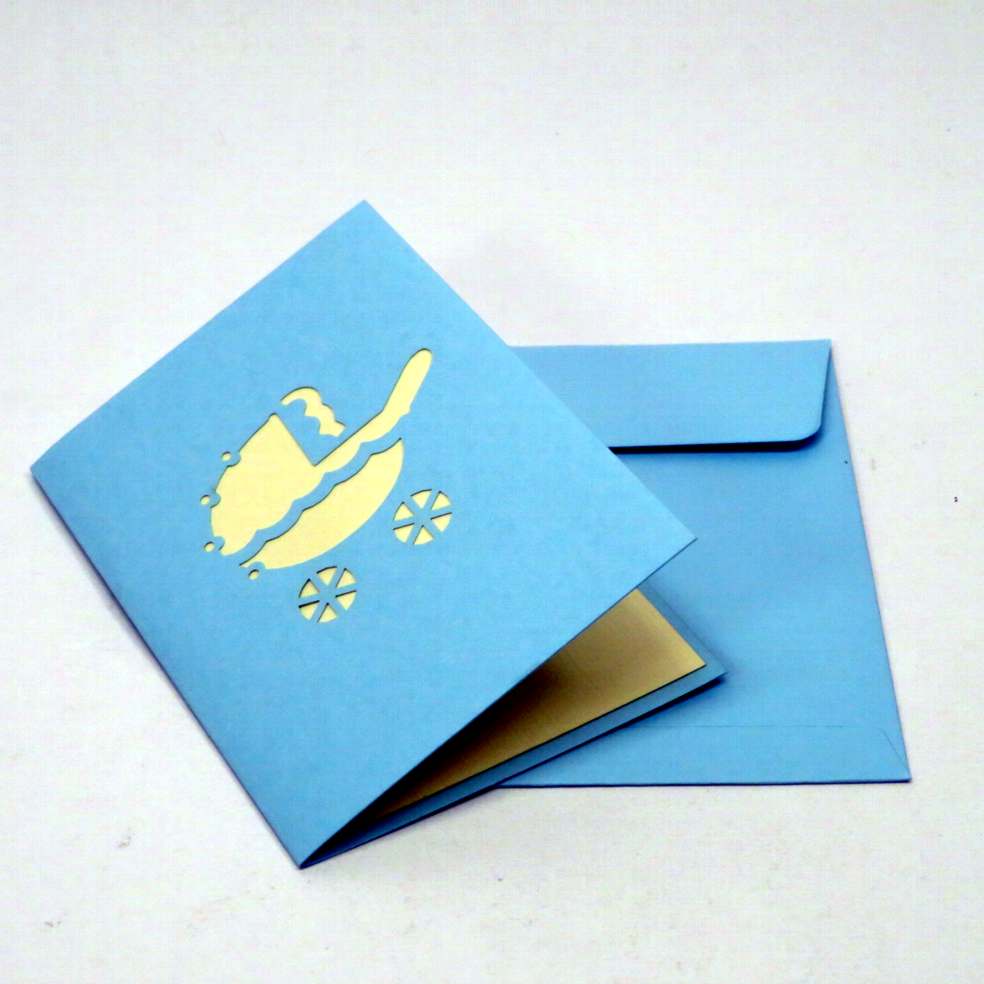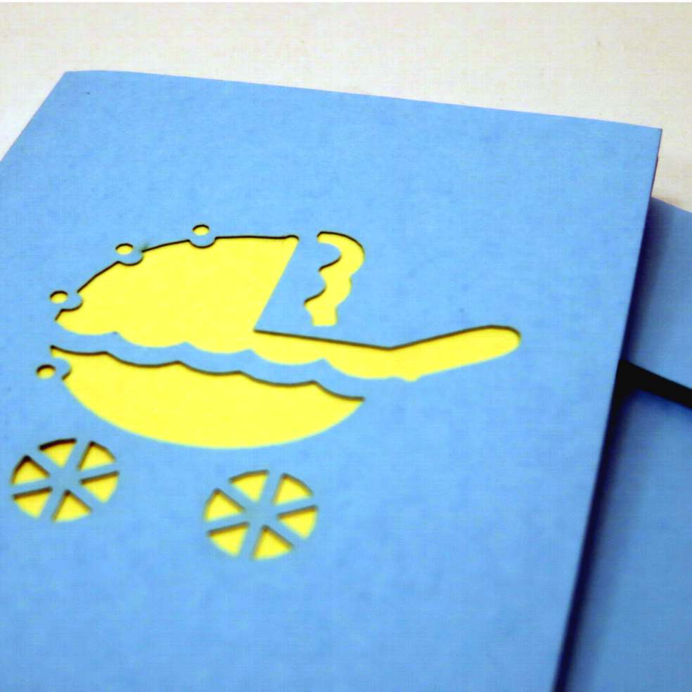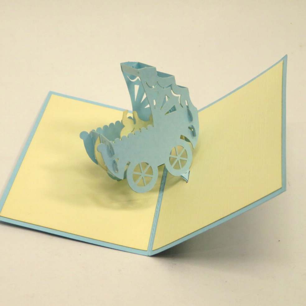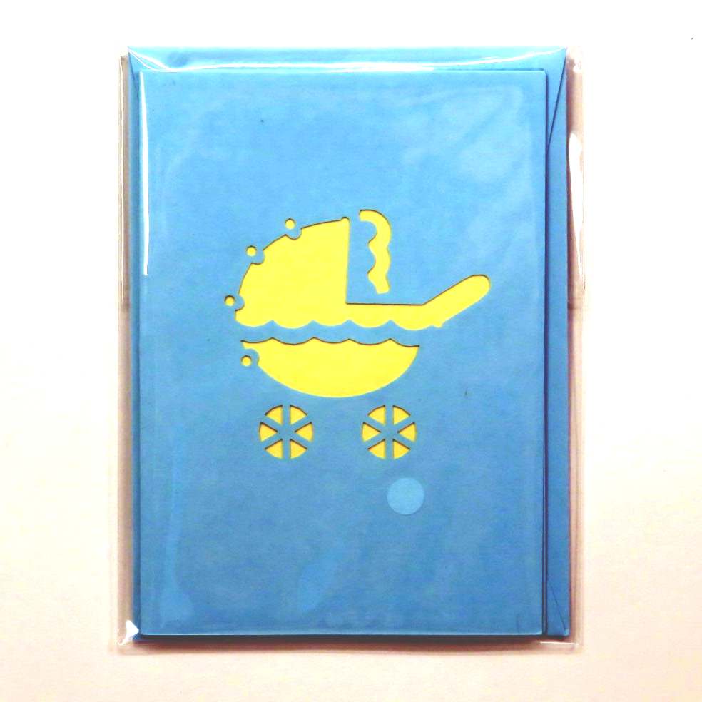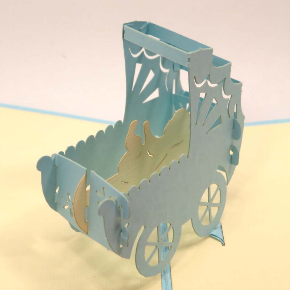 Biglietto augurale carrozzina celeste con bimbo, ideati da origamo Italia e costruiti con maestria nei laboratori in Vietrnam dove il suo titolare sostiene progelle di solidarietà con la popolazione della fondazione Christina Noble. Il biglietto di Origamo regala emozioni, toccandolo con mano si puo notare la manualità nell'esecuzione. Dimensioni 9X6.5cm.