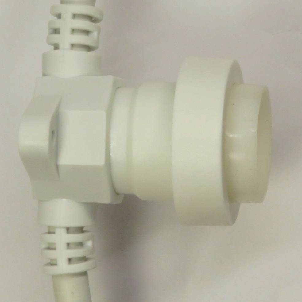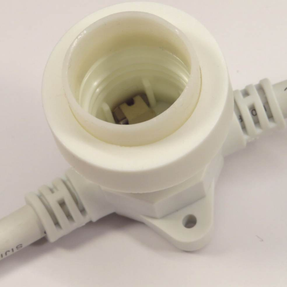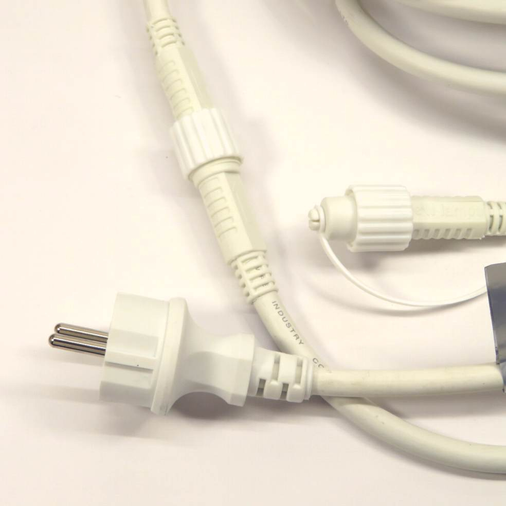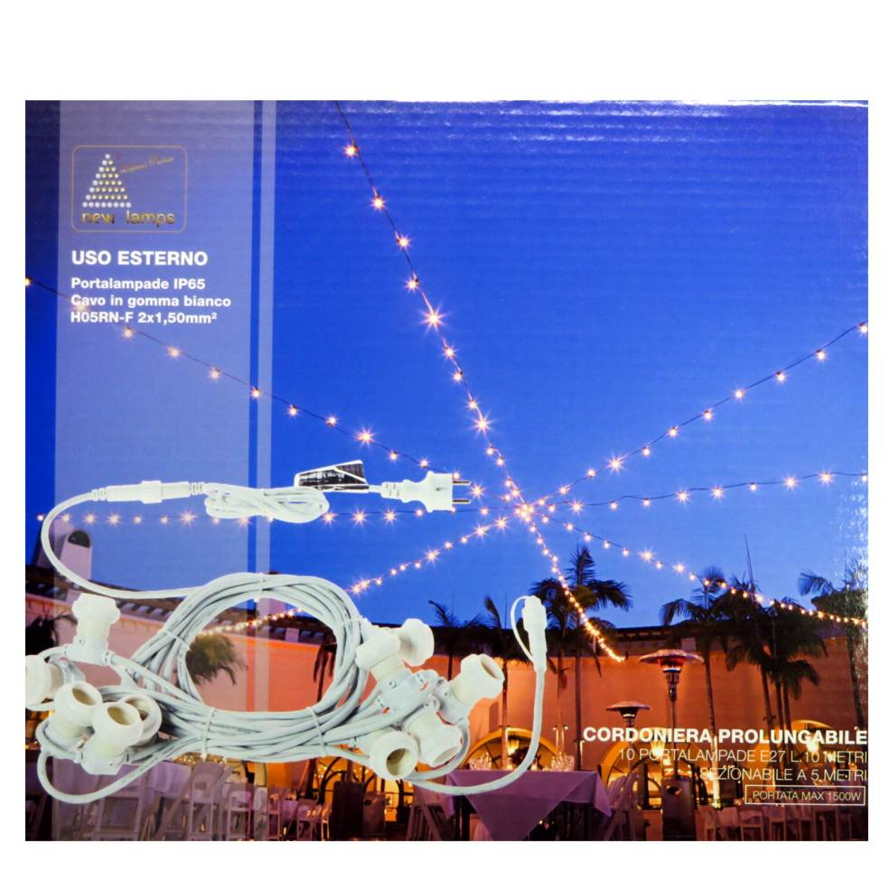 Cordoniera per uso esterno con 10 portalampade e27 in plastica con protezione in silicone, collegamento in parallelo (anche se manca una lampadina il cordone funziona). Il filo di luci è sezionabile in due elementi a 5m grazie al collegamento rapido fast link con isolamento IP44, si possono aggiungere rapidamente altri cordoni fino a 10pz (totale 400w max ogni filo e 100 lampadine, max 1500w di assorbimento). Alimentazione 240v con spina tipo schuko tedesca. Portalampade IP65 (buona resistenza ad acqua e polvere). Ogni portalampade è fornito di una piccola base piatta con 2 fori per fissarli in parete; in caso il cavo venga sospeso deve essere sostenuto da un tirante. Cavo bianco 2x1.5. Dalla spina al primo portalampade il cavo è lungo 2mt.