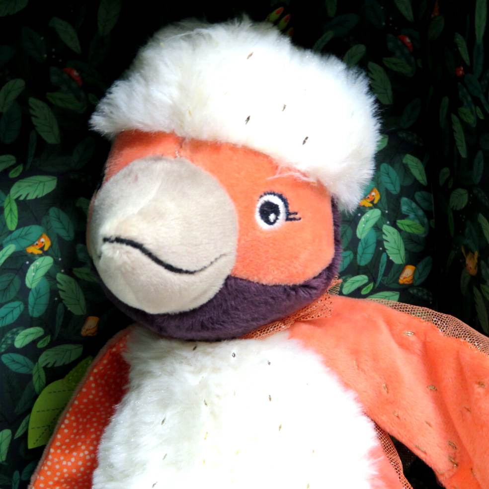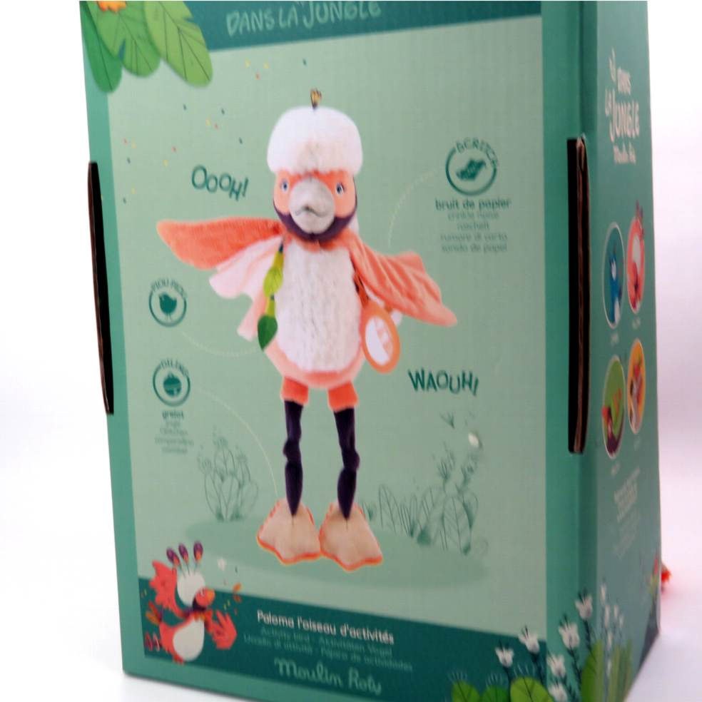 Paloma uccello pupazzo delle attività con morbido pupazzo Paloma dalla chioma bianca e colori sgargianti, brilla il suo piumaggio, lente per giocare, rumore di carta sfiorando le ali, campanellini sulle zampe. Scatola regalo finestrata con decorazione foglie interne. DIMENSIONI: altezza 25cm x 17x10cm