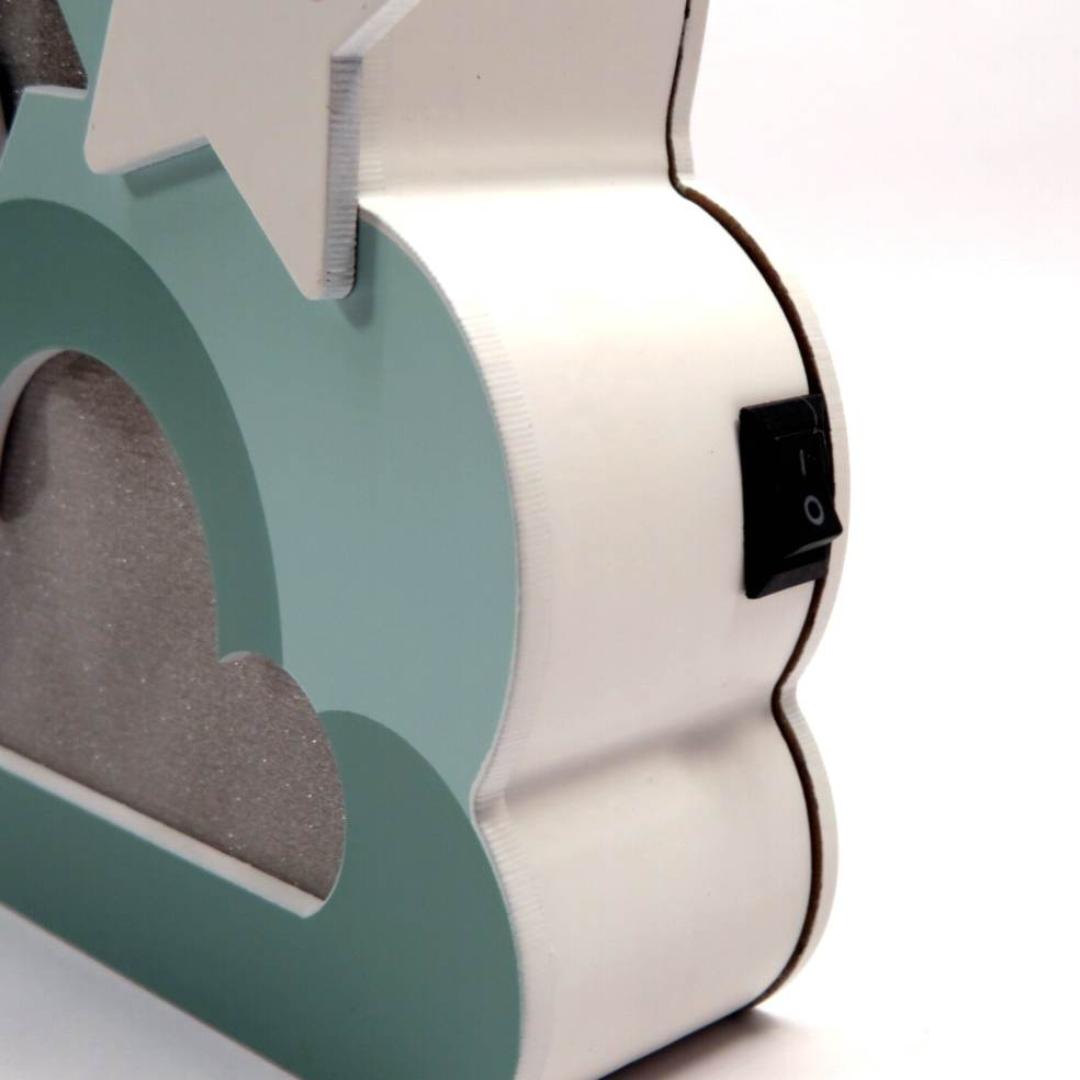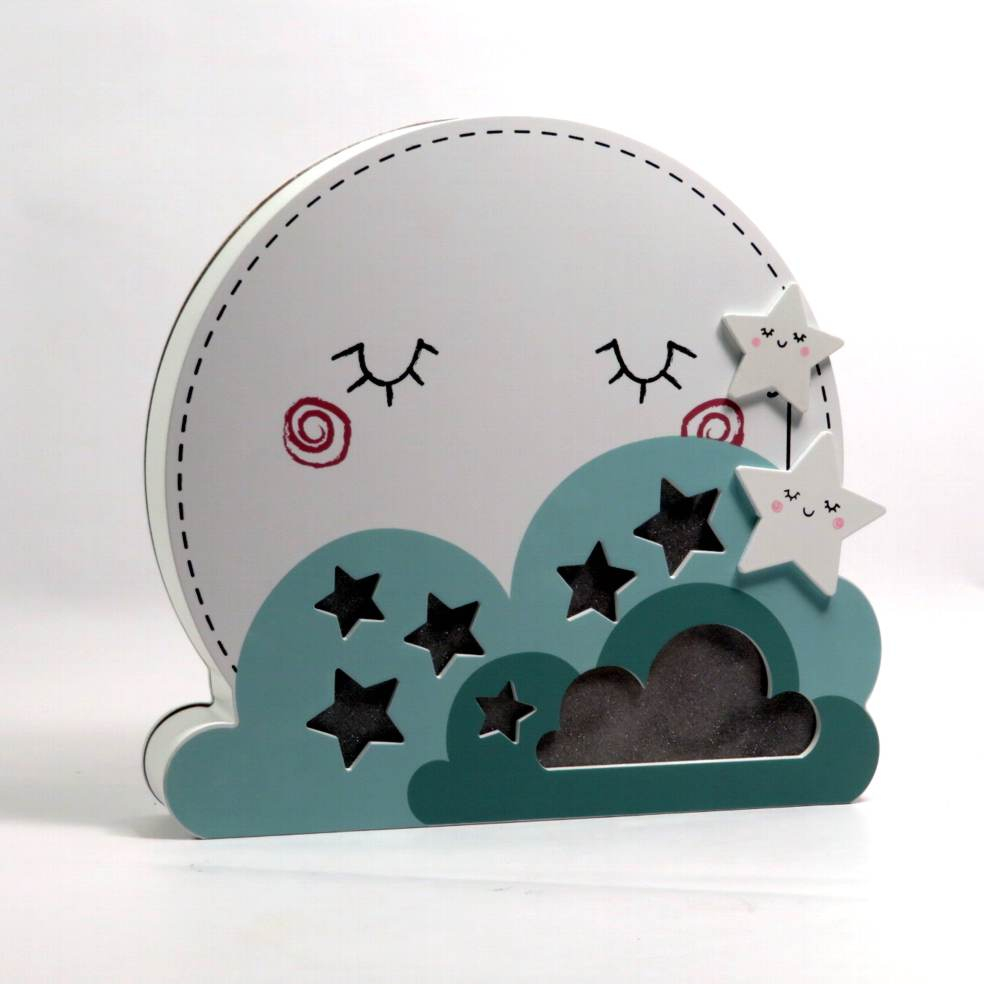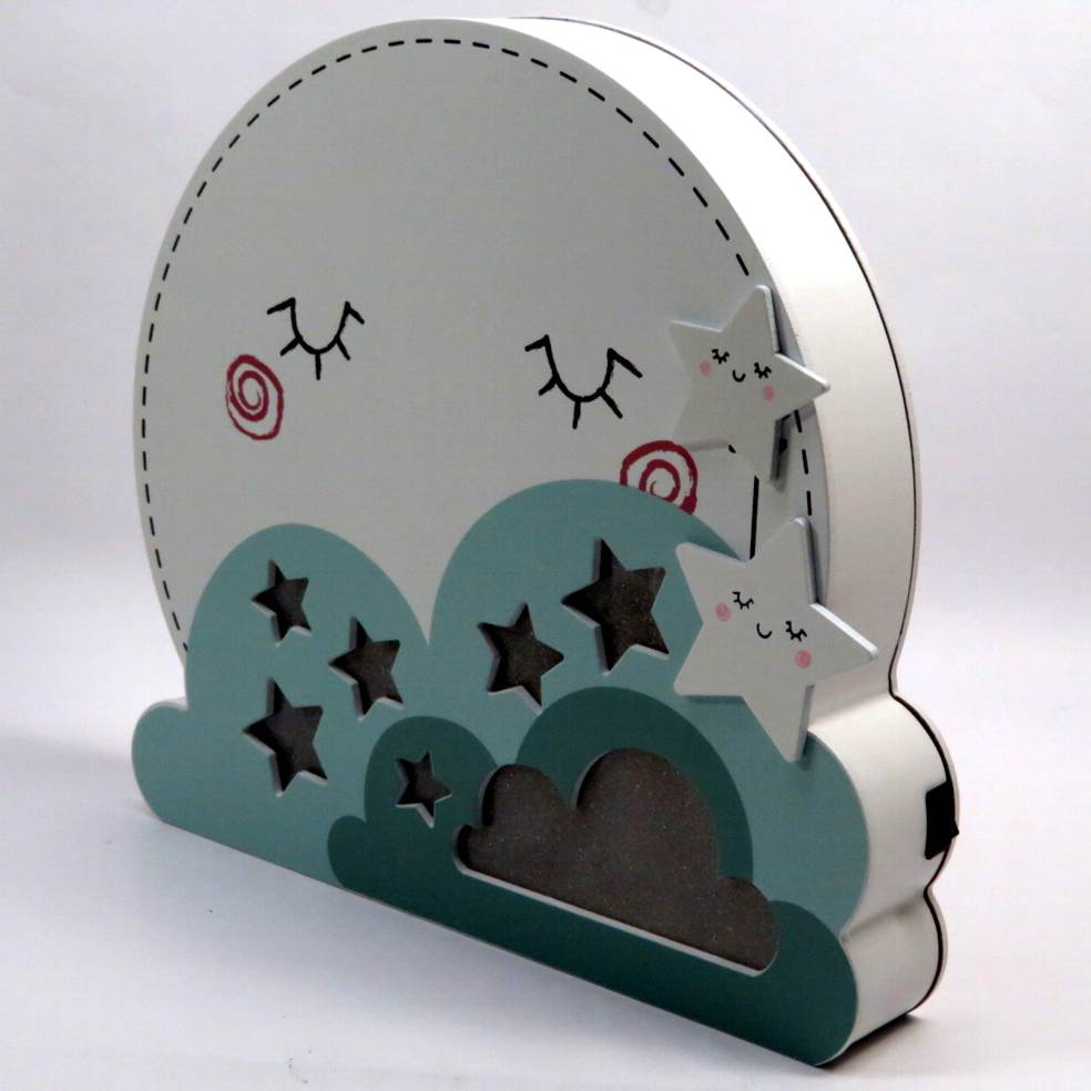 Lampada con forma di nuvola e luna che spunta, mentre le stelle sorridono alla notte. Un oggetto per la cameretta del bambino che si può appoggiare sul comodino o appenderla a parete per illuminare la notte. Interruttore sul lato per lo spegnimento, alimentazione con 2 batterie stilo AA sul retro. DIMENISONI 23X21,5X3,6cm