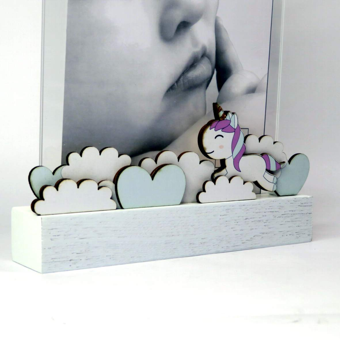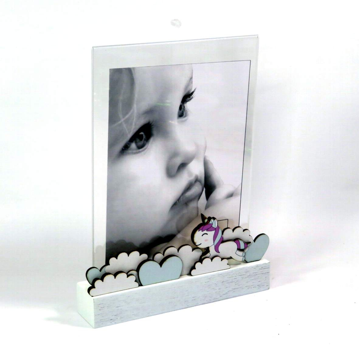 Cornice con base in legno con applicazione della figura del piccolo principe. Porta fotografie in plexiglass leggero per fotografie 13x18 verticali. DIMENSIONI: 18X3,5XH24cm