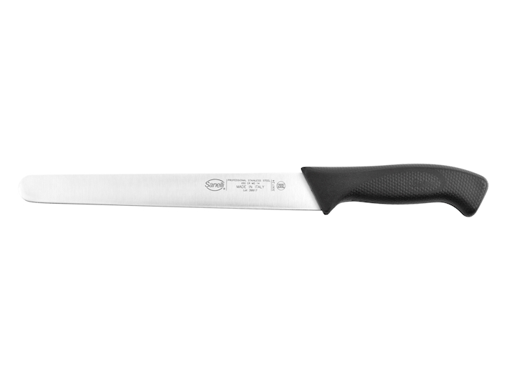 Coltello Cucina Sanelli con lama liscia modello Francese cm20 di lunghezza 20cm (lama circa 21), costruito in Italia. Per il lavaggio si consiglia lavaggio a mano per mantere l'affilatura e non utilizzare prodotti abrasivi acidi sulla lama. DIMENSIONI:35X5XH2,5cm