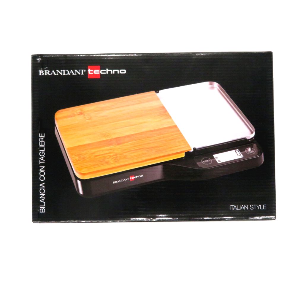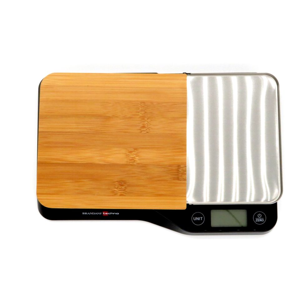 Bilancia digitale da cucina con piattino rimovibile in acciaio inox, vassoio laterale in legno di bamboo per tagliare e preparare gli alimenti da pesare, ampio display lcd con tasti con funzione tara, accensione/spegnimento e sceltà di unità di misura, grammi millilitri libbre e once. Portata massima 5kg con scansione al grammo. Funziona con 2 batterie ministilo AAA alcaline non incluse.