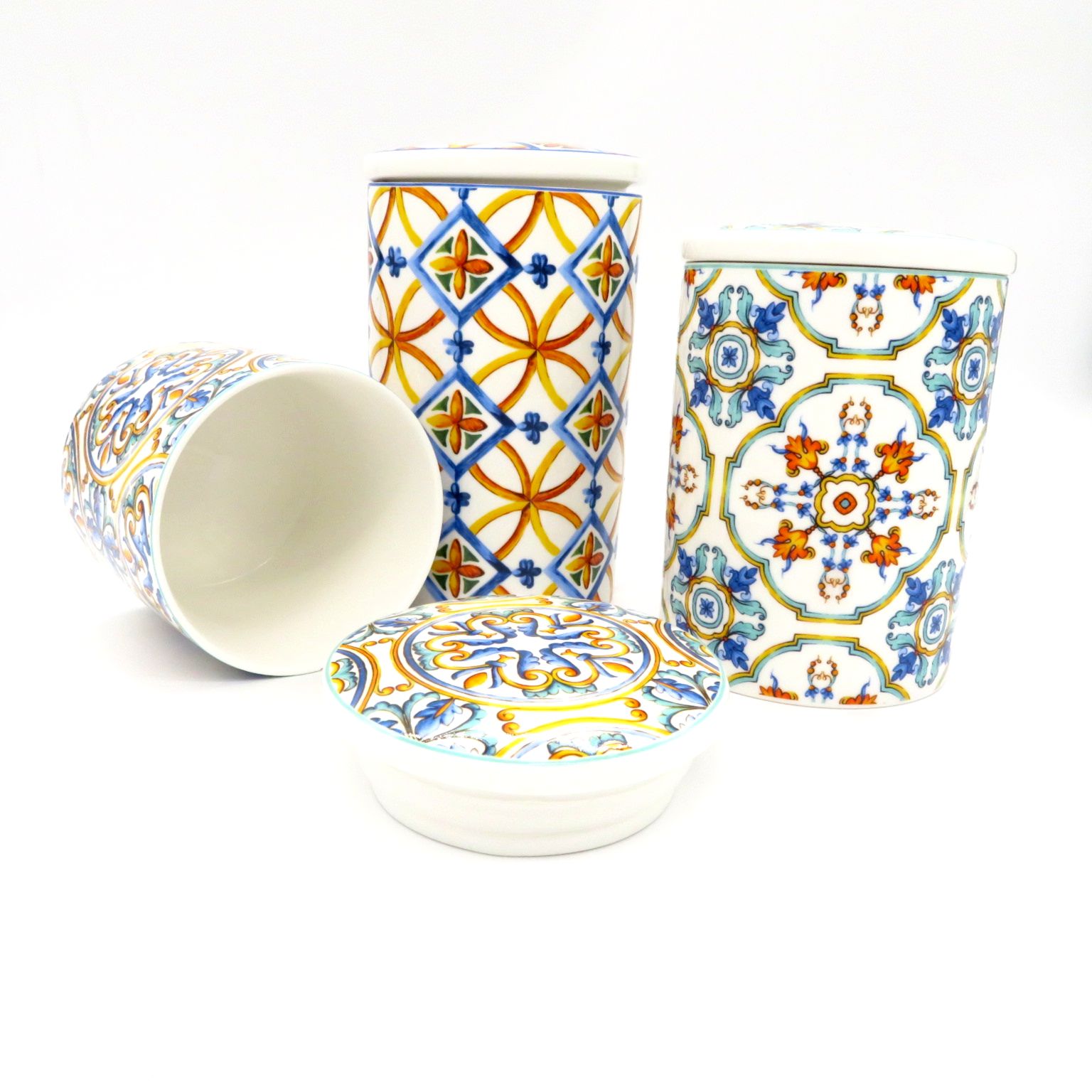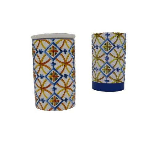Barattolo cilindrico in porcellana new bone china alto 13cm con decori Medicea, coperchio con guarnizione ed elegante scatola regalo decorata. DIMENSIONI: D10XH13cm