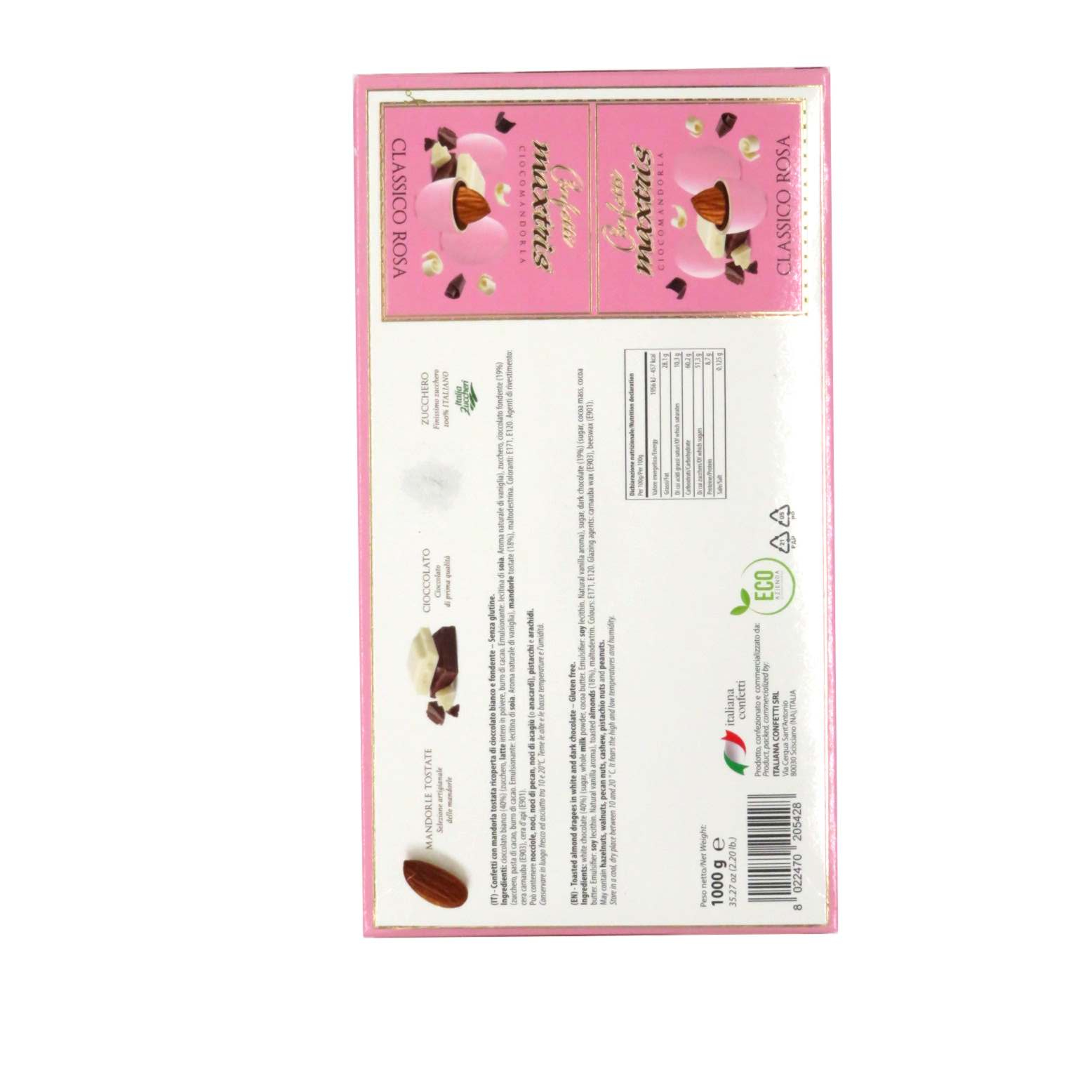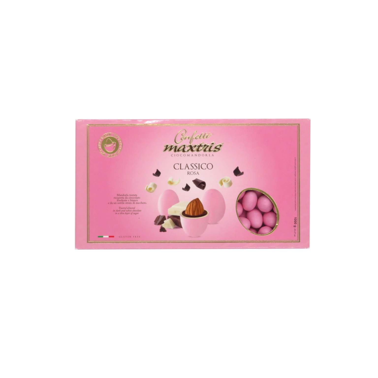 Maxtris confetti classico rosa con Mandorla tostata ricoperta da cioccolato fondente e bianco e da un sottile strato di zucchero. Ingredienti principali: Cioccolato bianco (40%), zucchero, cioccolato fondente (19%). Prodotto gluten free, made in Italy, confezione 1kg