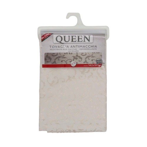 Tovaglia antimacchia in poliestere 100%, lavabile in lavatrice a 30 gradi (no centrifuga e stiro), disegno jacquard con cucitura dritta e colore bianco. Modello Queen. DIMENSIONI: 140x180cm
