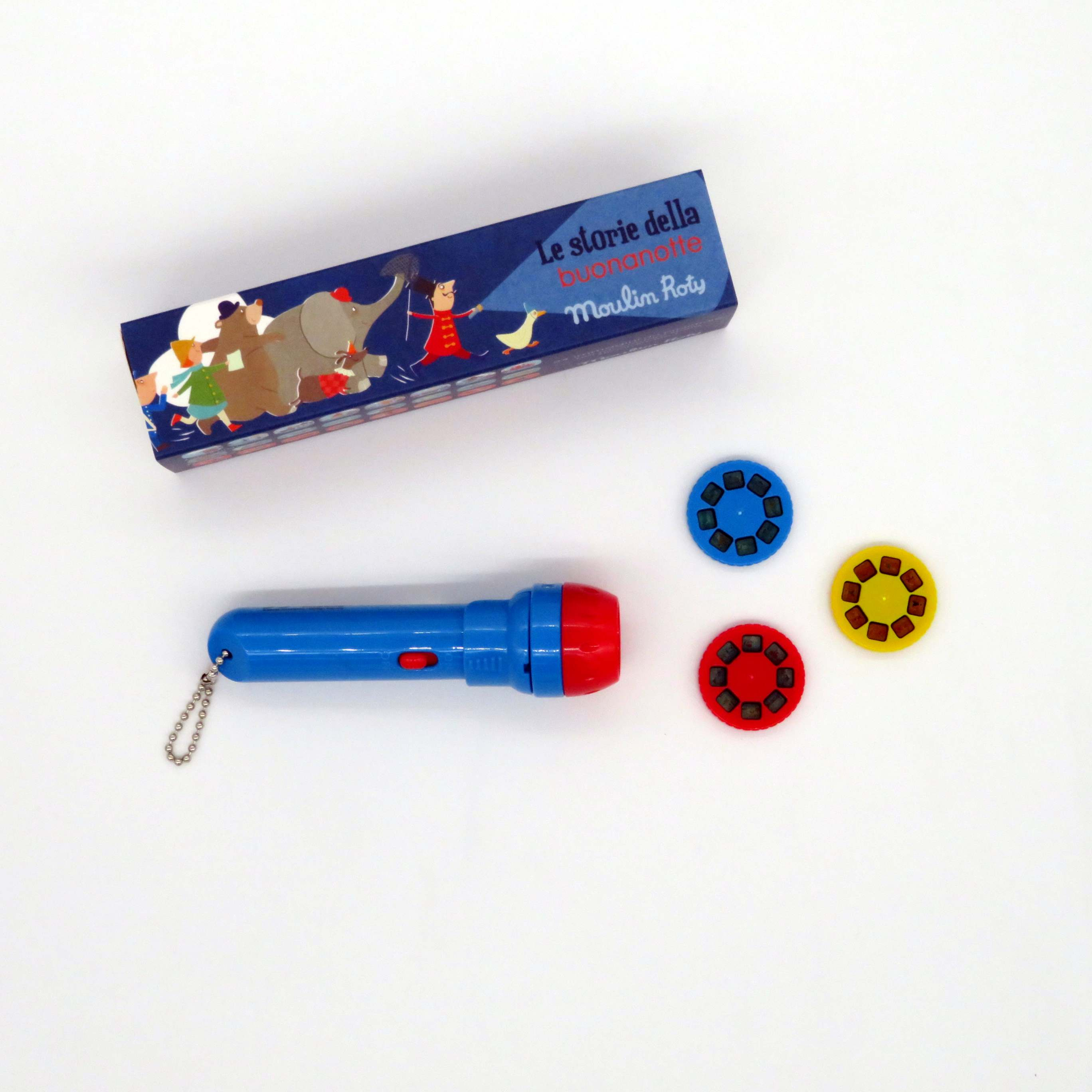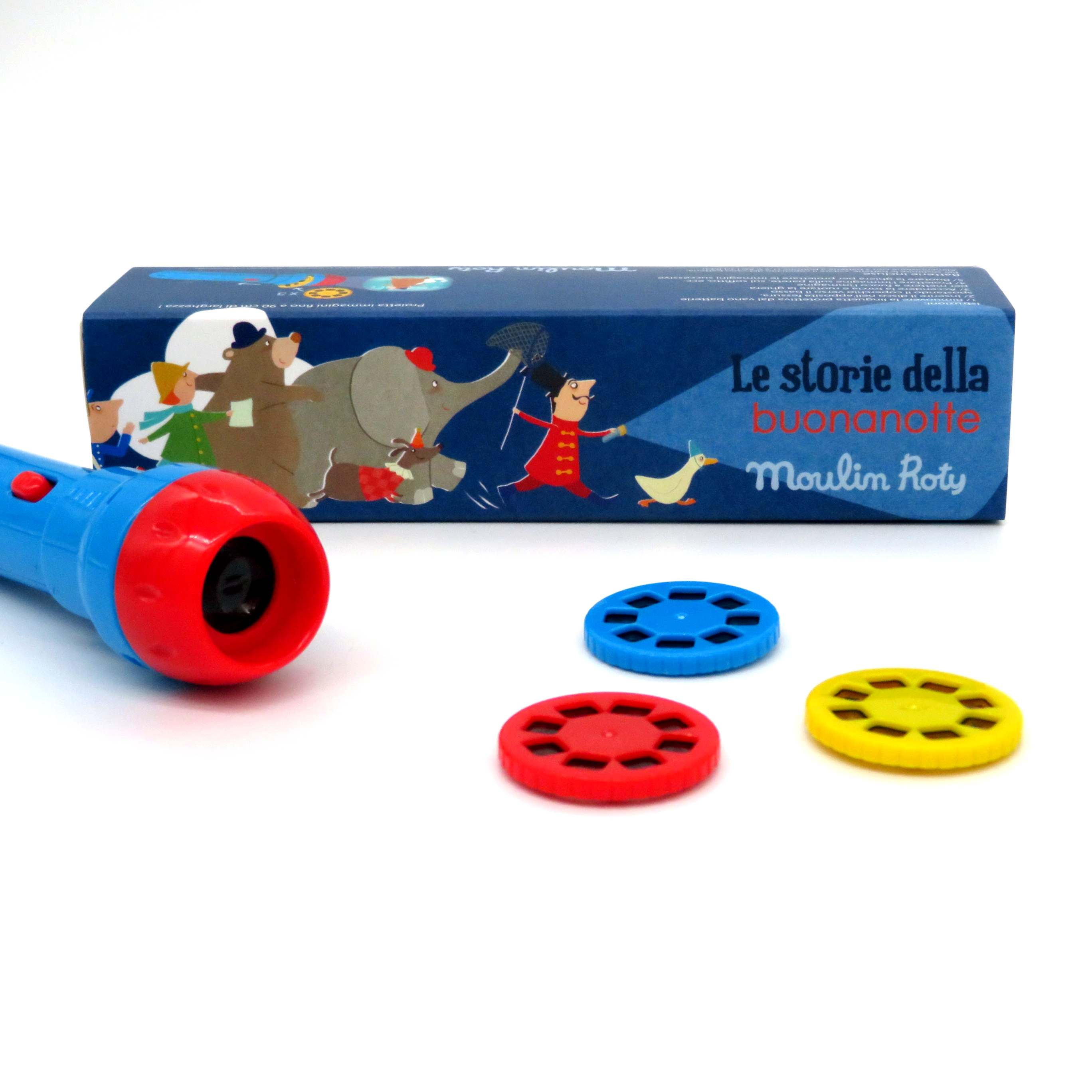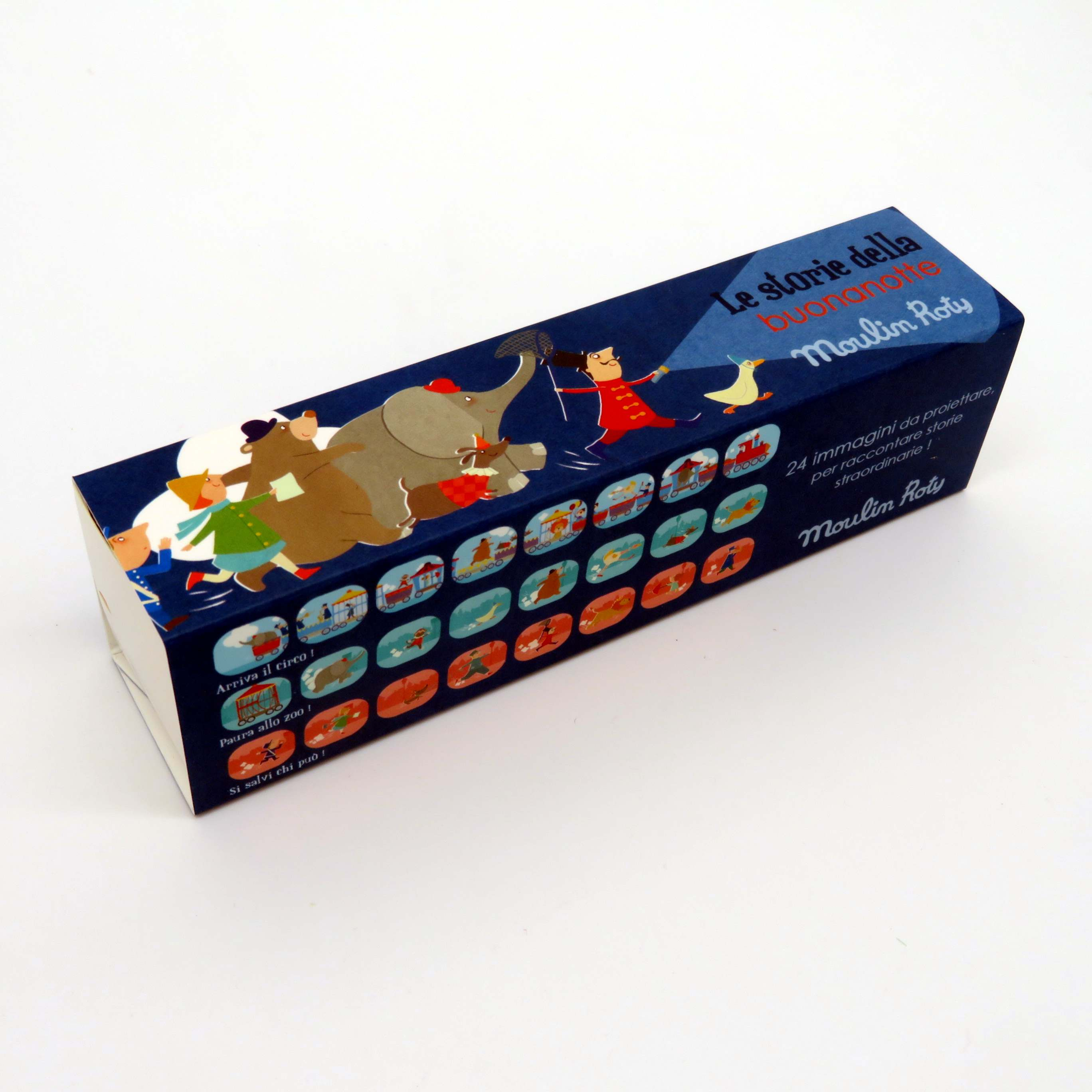 Le storie della buonanotte, immagina il papa o la mamma seduti con il looro piccolo sul lettino metre con la piletta magica proiettano nel soffito o nella parete, nel buio della notte, le storie del circo e dello zoo, le storie di simpatici animali. 24 immagini si susseguono e aspettano solo di essere raccontate dal genitore che accompagna il bambino nei sogni più fantasiosi.