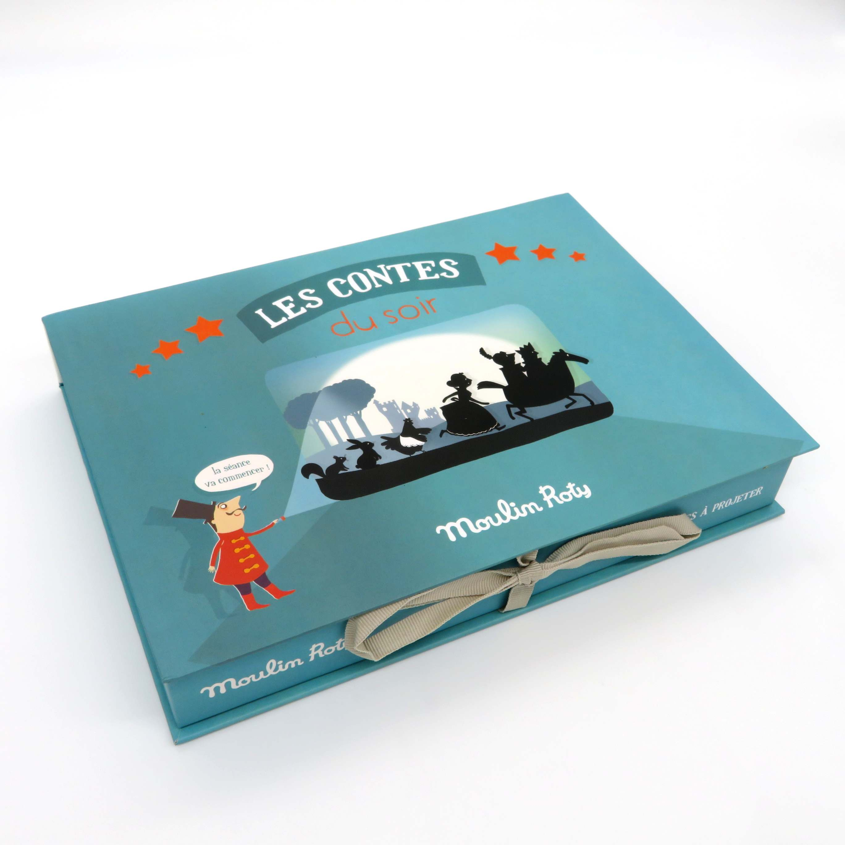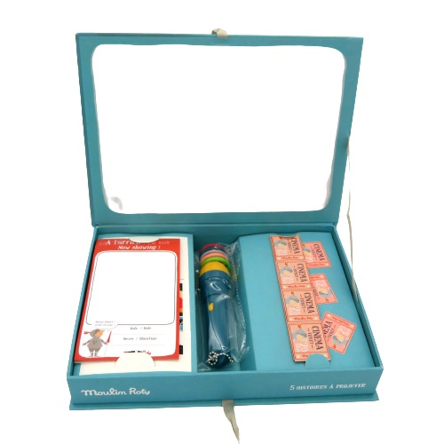 Cofanetto cinema di Moulin Roty composto di una pannello cinema in cartone dove proiettare le storie con la lampada in dotazione, 5 storie diverse e 40 immagini che il genitore racconterà con fantasia al suo piccino, mentre questo entusiasto spalancherà gli occhietti ascoltando con attenzione. In dotazione anche biglietti per partecipare allo spettacolo e foglietti per gli appunti. DIMENSIONE COFANETTO: 26X19XH4