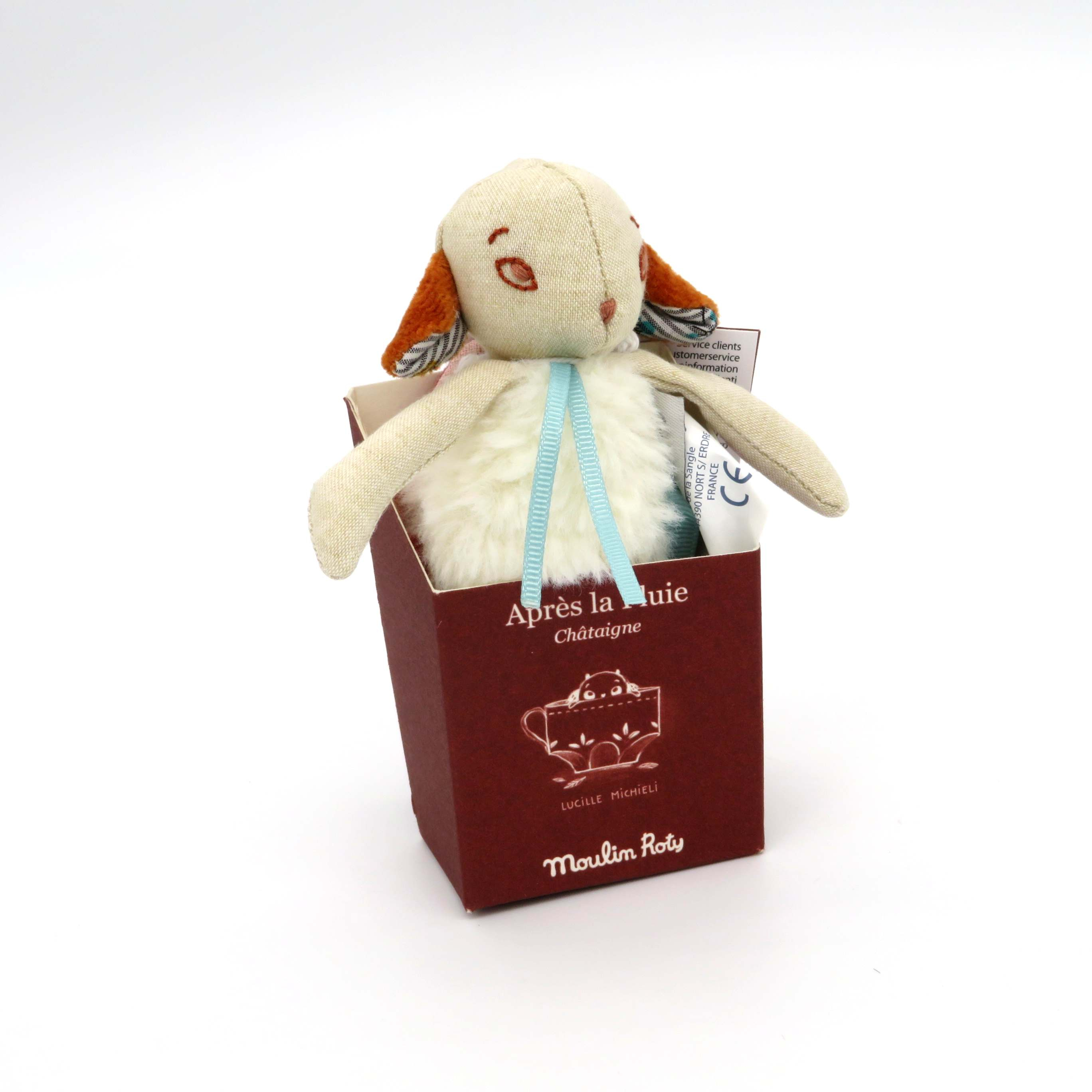 La pecora della collezione Apres la pluie di Moulin Roty, collezione immaginata da Lucille Michieli, si riposa in una foglia dalla quale viene avvolta in un caldo abbraccio. Simpatici baffetti, occhi cuciti con amore, orecchiette morbide rosa.Altezza 14cm. Tessuto poliestere, lavabile a mano a 30 gradi.