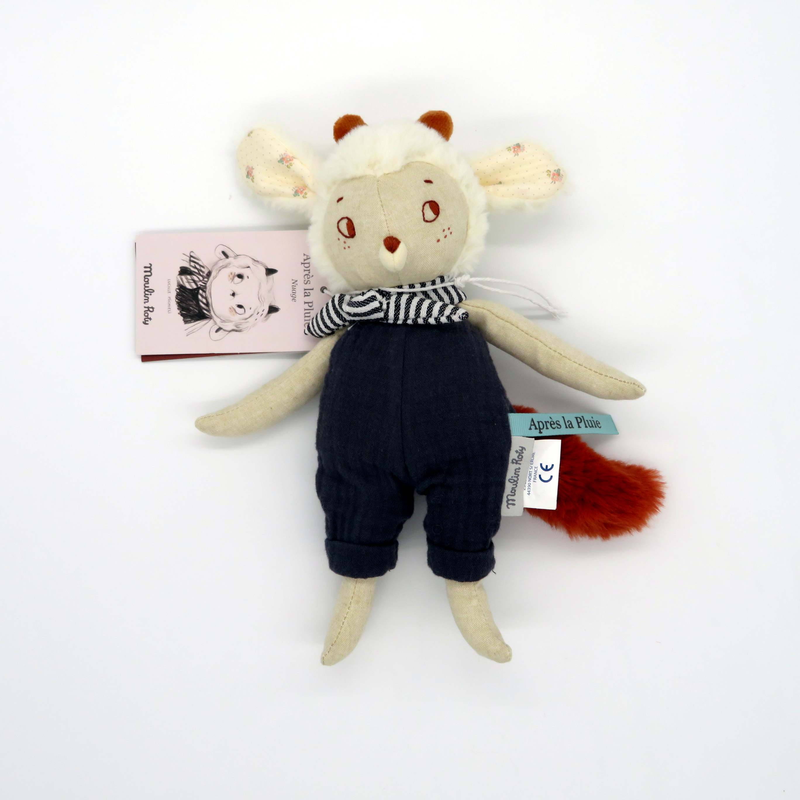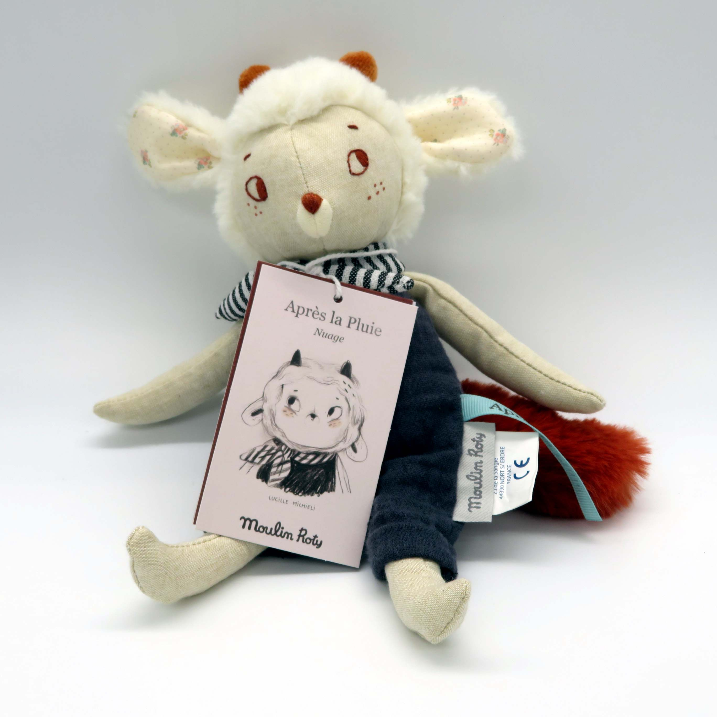 I personaggi della linea Apres la pluie di Moulin Roty, immaginati dalla stilista Lucille Michieli, ispirati dalla sua infanzia, esprimono nei loro volti la voglia di coccole, accompagnano il sonno ed il risveglio del bambino. Nuage è la pecora con la coda rossa, la sciarpetta a righe bianche e nere uno sguardo amorevole e 2 orecchiette morbide con fiorellini disegnati. ALTEZZA 24cm