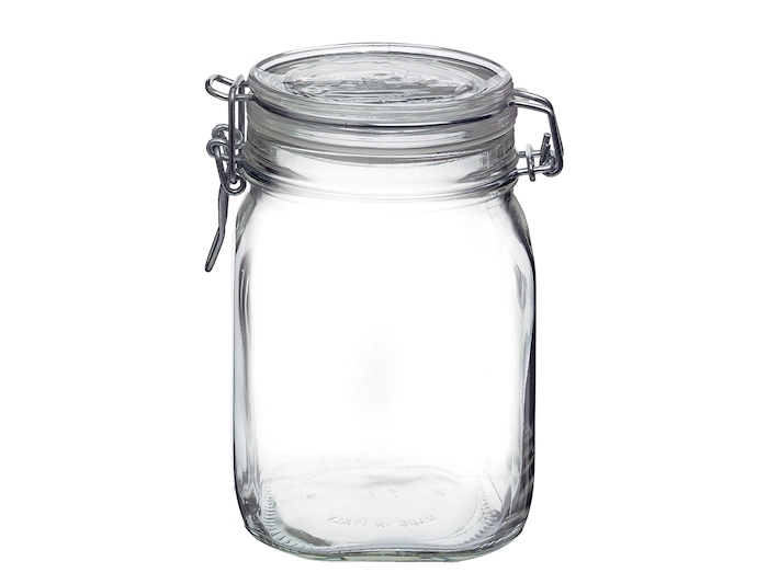Vaso barattolo in vetro modello Fido di Bormioli, base quadrata, con cerniera in metallo per l'apertura e guarnizione ad anello di misura standard. Capacità 1,5lt, foro di apertura 8,7cm, altezza 22cm, fatto in Italia.