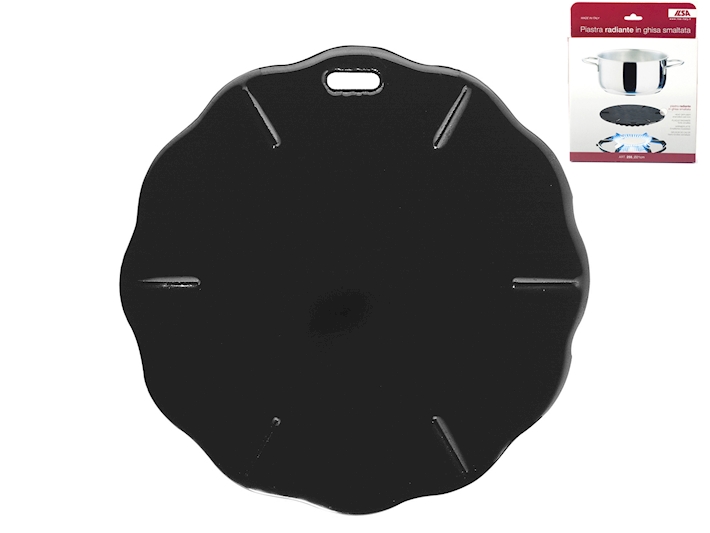 Piastra radiante in ghisa smaltata, l'ideale per la corretta diffusione del calore sul fondo delle pentole, evita di dover mescolare i cibi in cottura. La piastra radiante evita anche l'annerimento esterno provocato dalla fiamma sulle pentole, conservandole cosi lucenti e brillanti come nuove. Utensile indispensabile per pentole in Pyrex, vetro da fuoco, e terracotta. In dotazione un manico per toglierla agevolmente dal fuoco. Non adatta a piani ad induzione. DIMENSIONI: D18XH1cm