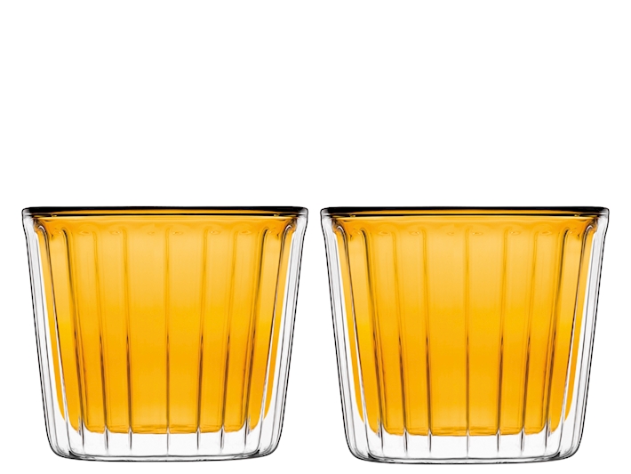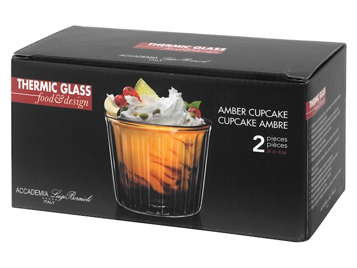 Set 2 coppette cupcake in leggerissimo vetro borosilicato doppia parete, fatto a mano, resistente agli sbalzi termici. Idoneo al microonde e lavabile in lavastoviglie. Mantiene la temperaturea sia delle bevande e cibi caldi e freddi. Colore AMBRA. Capacità 24cl. DIMENSIONI: D9cm H7,5cm