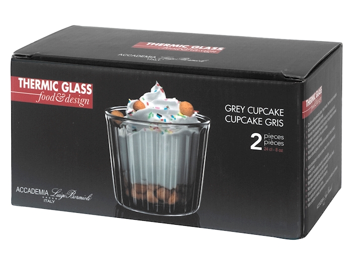 Set 2 coppette cupcake in leggerissimo vetro borosilicato doppia parete, fatto a mano, resistente agli sbalzi termici. Idoneo al microonde e lavabile in lavastoviglie. Mantiene la temperaturea sia delle bevande e cibi caldi e freddi. Colore GRIGIO. Capacità 24cl. DIMENSIONI: D9cm H7,5cm