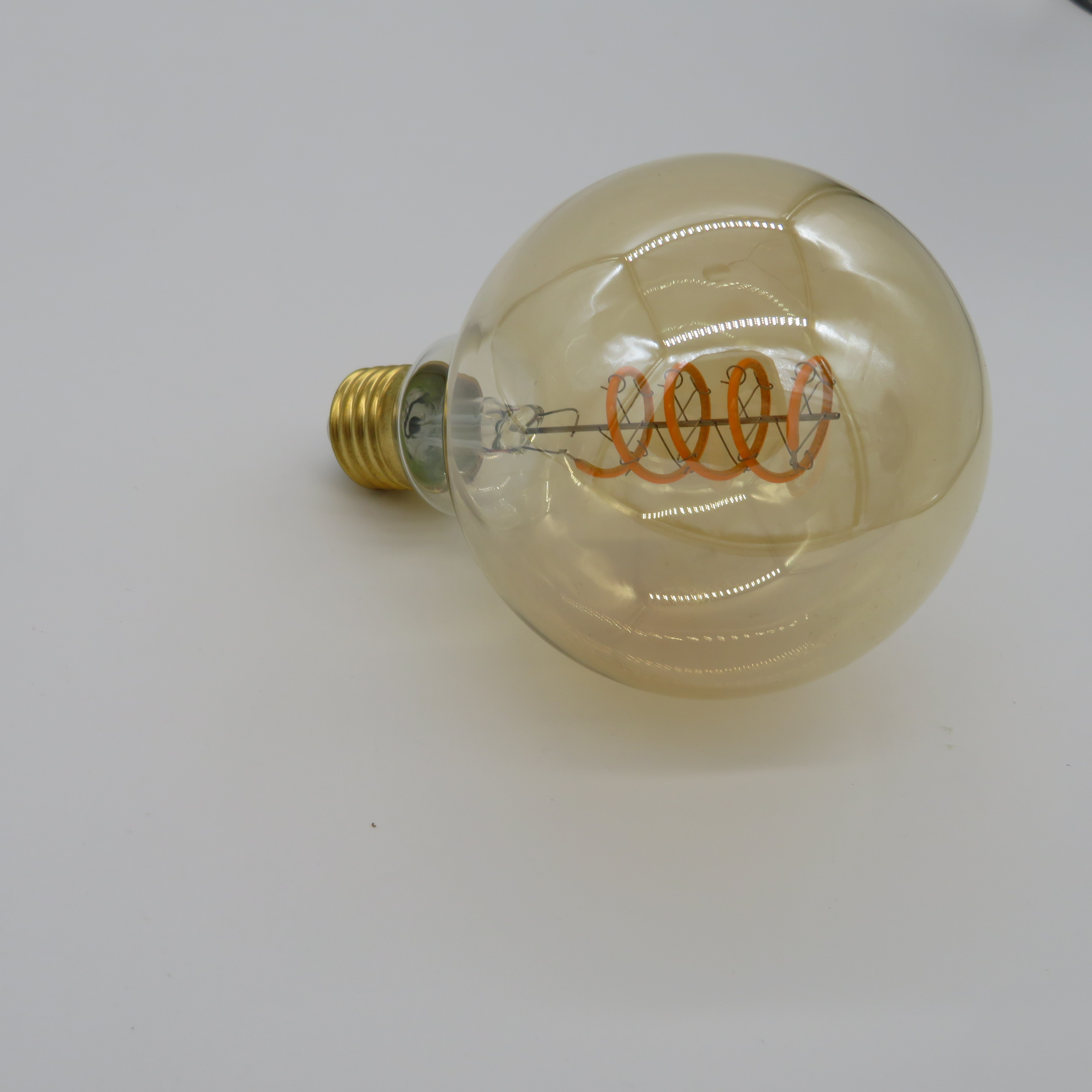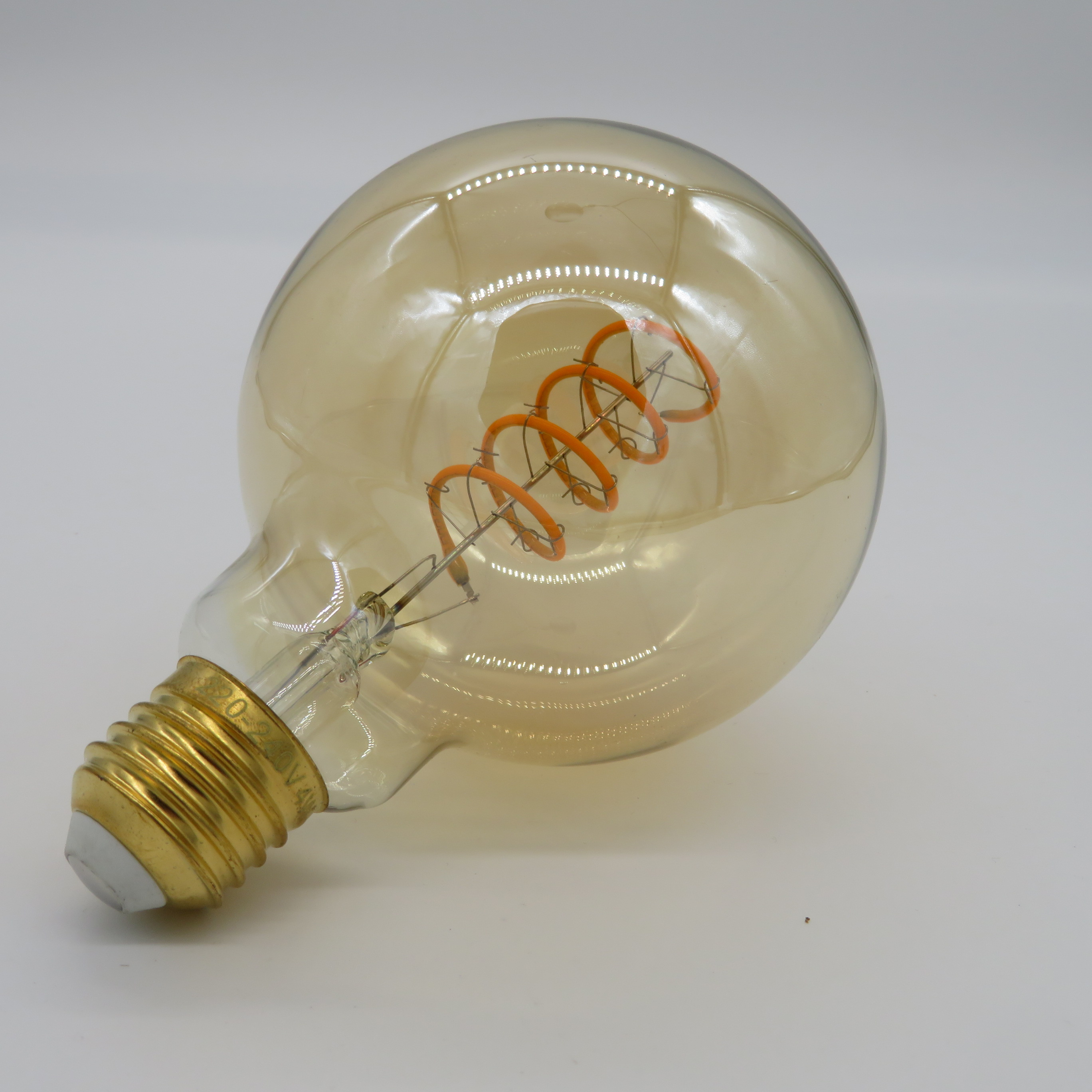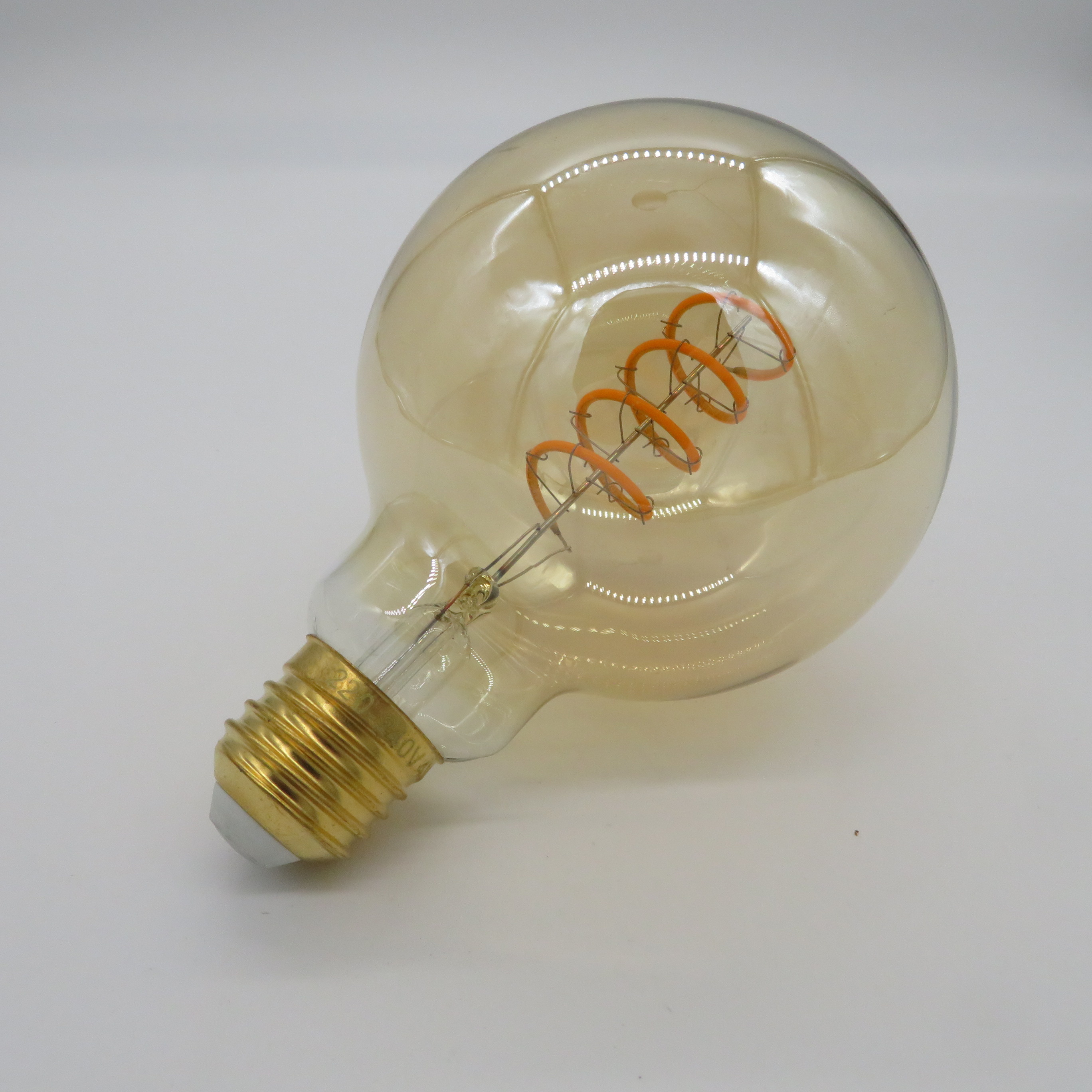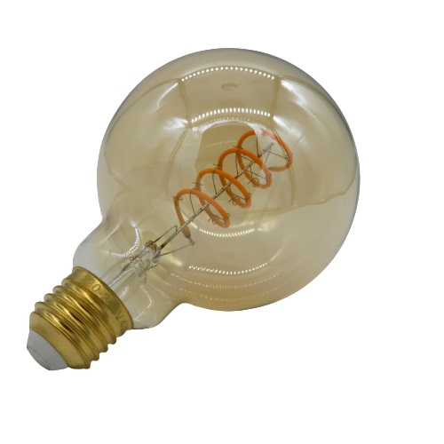 Lampadina globo cm9 di diametro in vetro ambrato trasparente effetto vintage, filamento di led centrale con forma a spirale. Effetto decorativo di sicuro fascino. 250 Lumen di luminosità, pari ad una tradizionale lampadina ad incandescenza da 25w. Consumo solo 4w. Regolabile di intensità luminosa con dimmer (non in dotazione). Luce calda 2200k, durata circa 15000 accensioni. Diametro vetro 9,5cm, attacco e27.