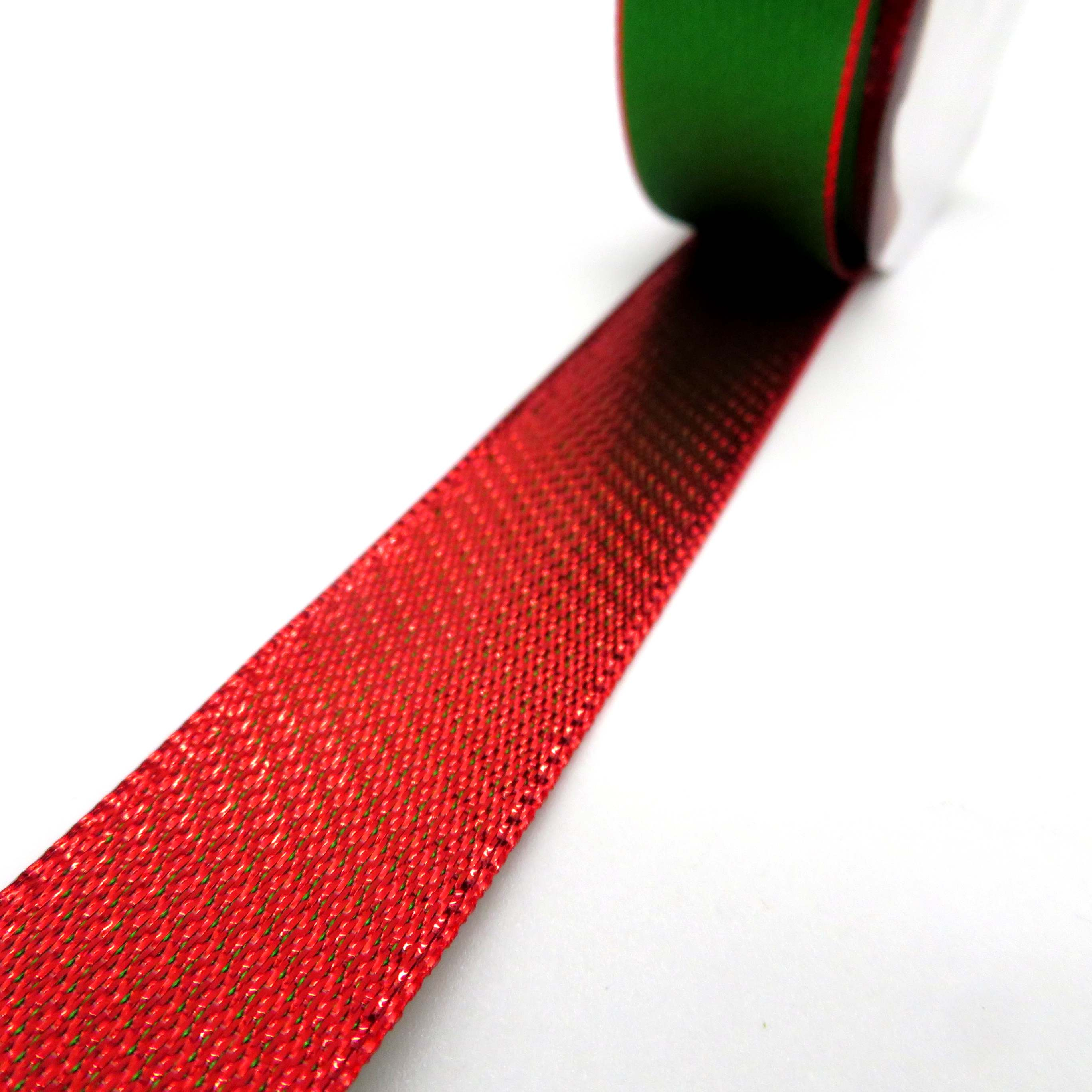 Nastro fetuccia alto 60mm con 2 lati colorati, verde brillante con bordino rosso e sul retro rosso brillante. Venduto a metro, il rotolino misura 10mt