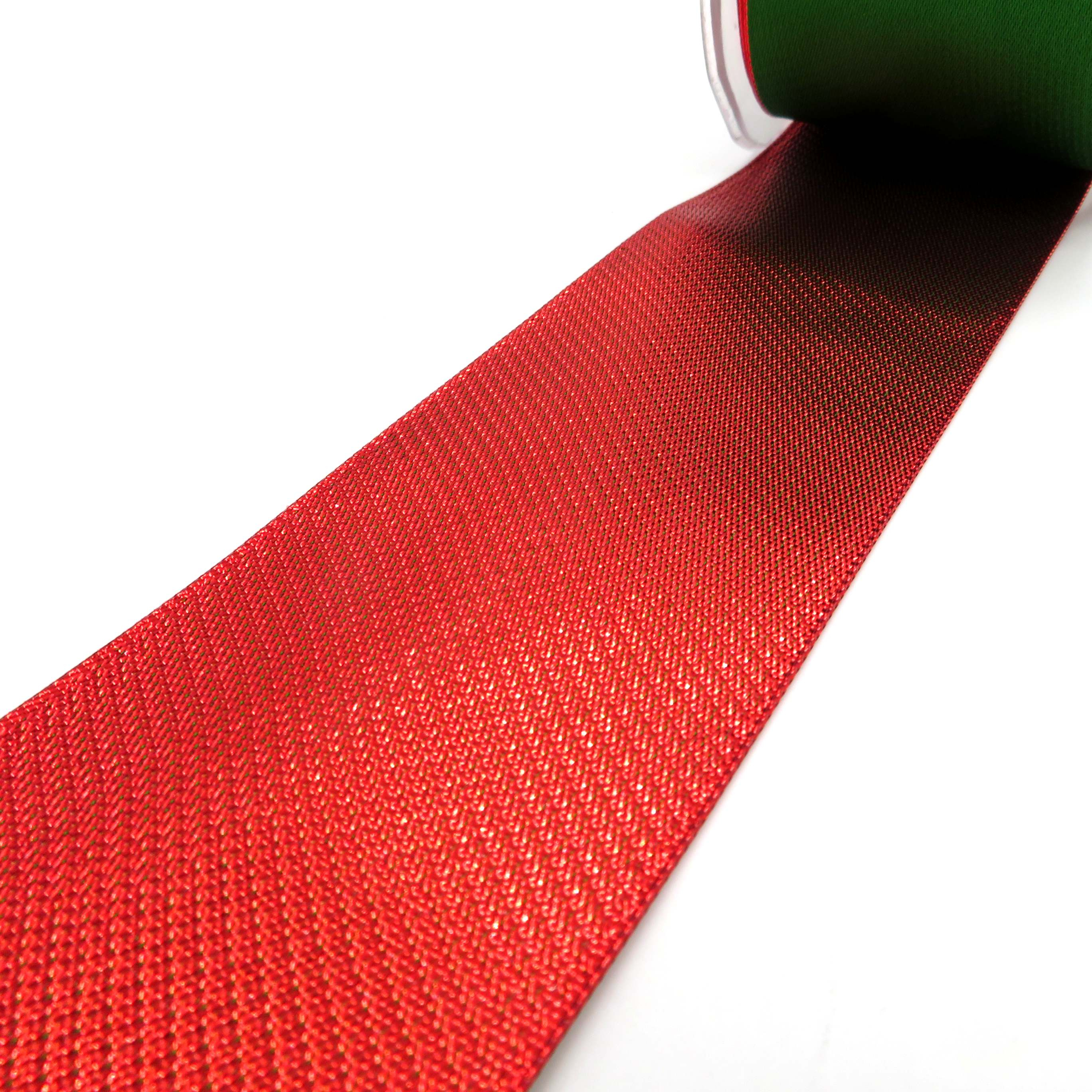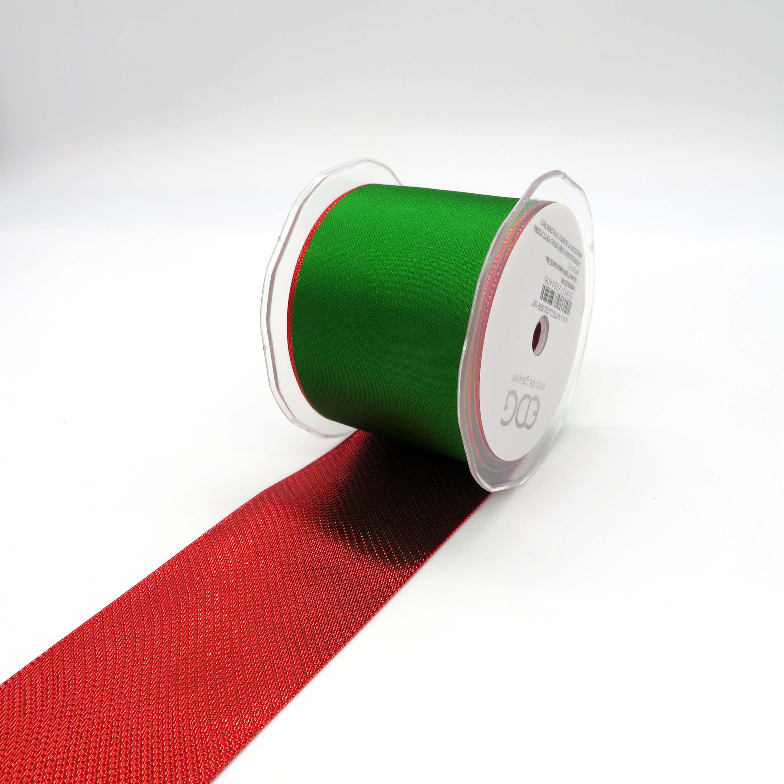 Nastro fetuccia alto 25mm con 2 lati colorati, verde brillante con bordino rosso e sul retro rosso brillante. Venduto a metro, il rotolino misura 10mt