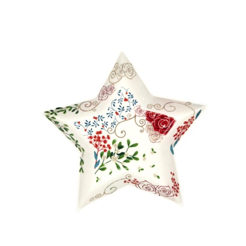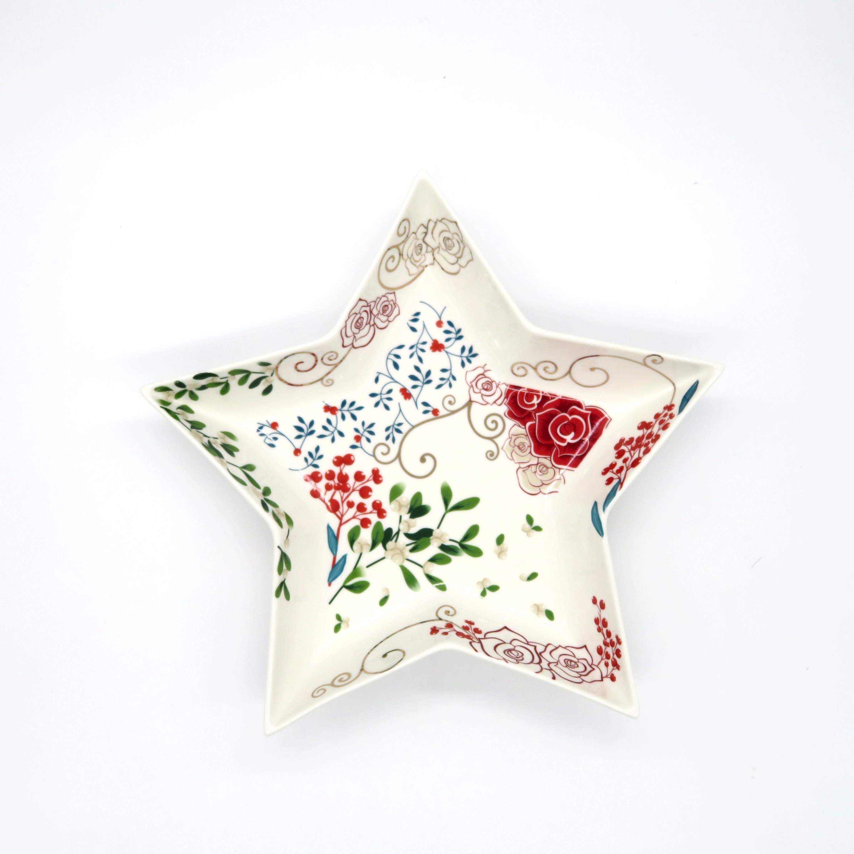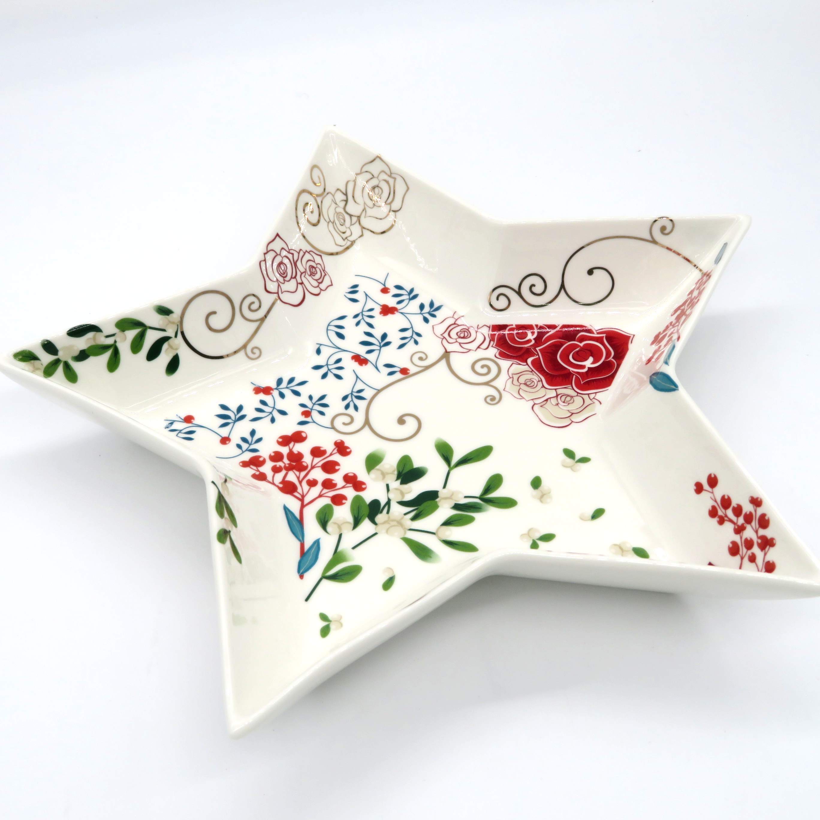 Centrotavola quadrato 24x24cm in porcellana decoro floreale, vischio e renna rossa con finiture oro. Elegante scatola regalo. DIMENSIONE:24x24cm