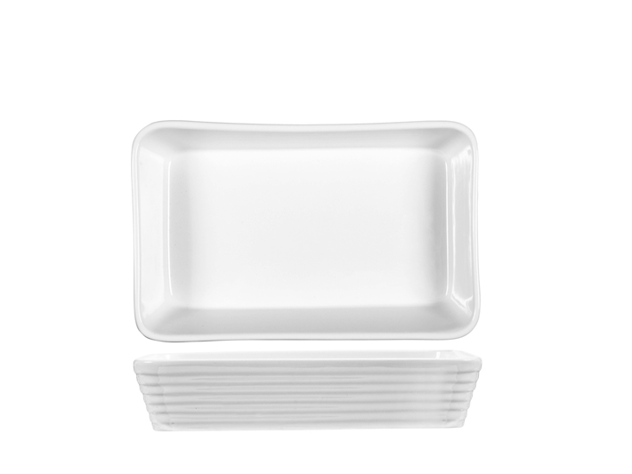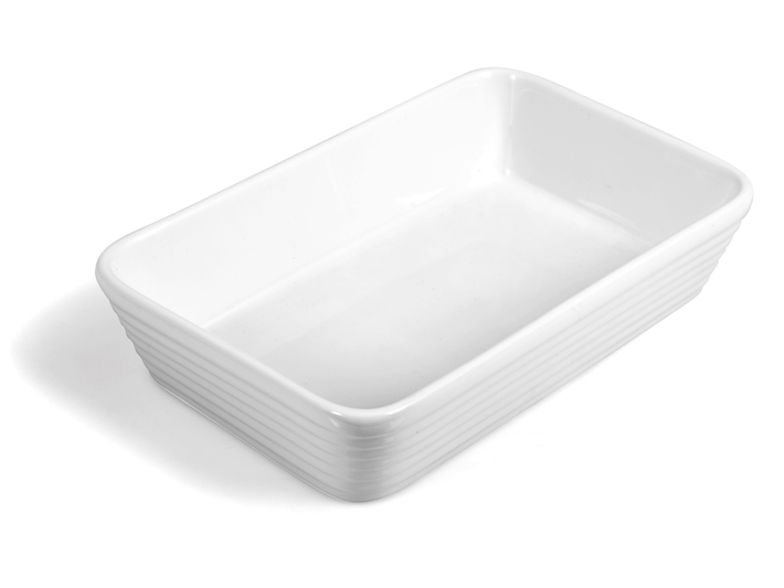 Pirofila da forno in porcellana bianca da forno, rettangolare 25x15cm, altezza 6cm, nei lati decorata con linee orizzontali in rilevo, interno liscio. Ideale per cotture nel forno tradizionale o microonde, lavabile in lavastoviglie ed adatta anche all'utilizzo nel congelatore.