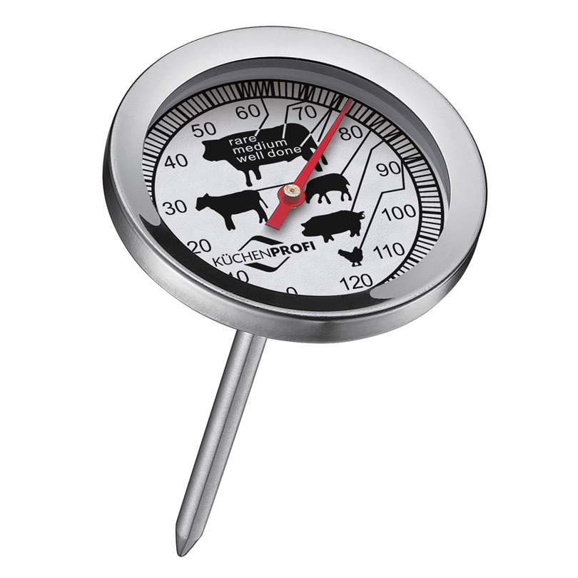 Termometro meccanico per la misurazione della temperatura della carne come pollame, maiale, agnello, selvaggina e manzo. Campo di misura è tra 0°C e 120°C. Grazie alla sonda termica in acciaio inossidabile, la precisione è garantita. Le indicazioni grafiche sul quadrante aiuteranno a tenere sotto controllo la termperatura del cibo.