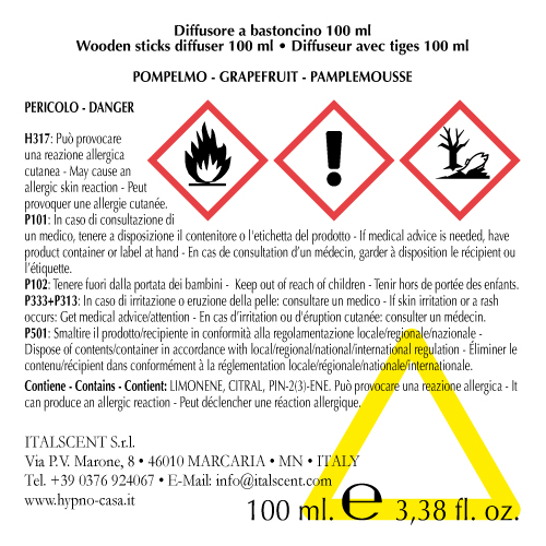 Diffusore di profumo per ambiente, con bastoncini in legno che si intingono nel profumo POMPELMO. La capacità del contenitore è di 100ml. Il prodotto è naturale, con sentori olfattivi agrumata, colore giallo trasparente. Una volta terminato il prodotto si possono acquistare le ricariche di profumo e i bastoncini. DIMENSIONI: D4,5 H11,5 solo contenitore.