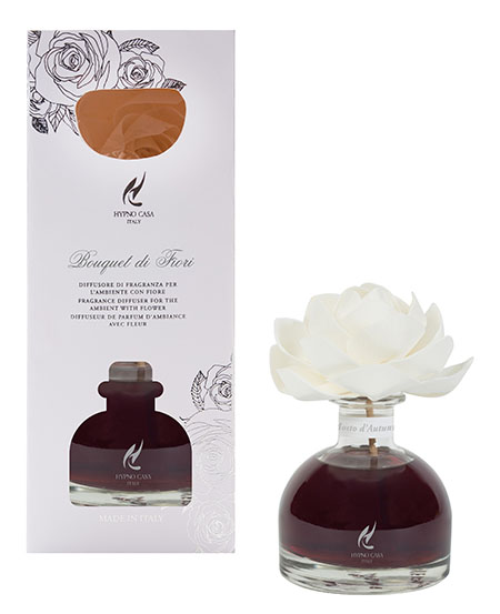 Diffusore di profumo per ambiente, con fiore in carta sostenuto da un astina in legno che si intinge nel profumo MOSTO D'AUTUNNO. La rosa diffonde il profumo con i suoi petali che ne assorbono oltre al profumo anche il colore. La capacità del contenitore è di 100ml. Il prodotto è naturale, dopo il completo assorbimento il fiore continuerà a profumare. Una volta terminato il prodotto si possono acquistare le ricariche di profumo e il fiore di carta. DIMENSIONI: D7 H9 solo contenitore, H13cm con fiore.