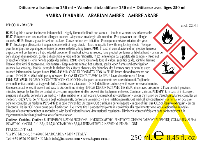 Diffusore di profumo per ambiente, con bastoncini in legno che si intingono nel profumo AMBRA D'ARABIA. La capacità del contenitore è di 250ml. Colore nero. Una volta terminato il prodotto si possono acquistare le ricariche di profumo e i bastoncini. DIMENSIONI: D6,5 H15,5 solo contenitore.
