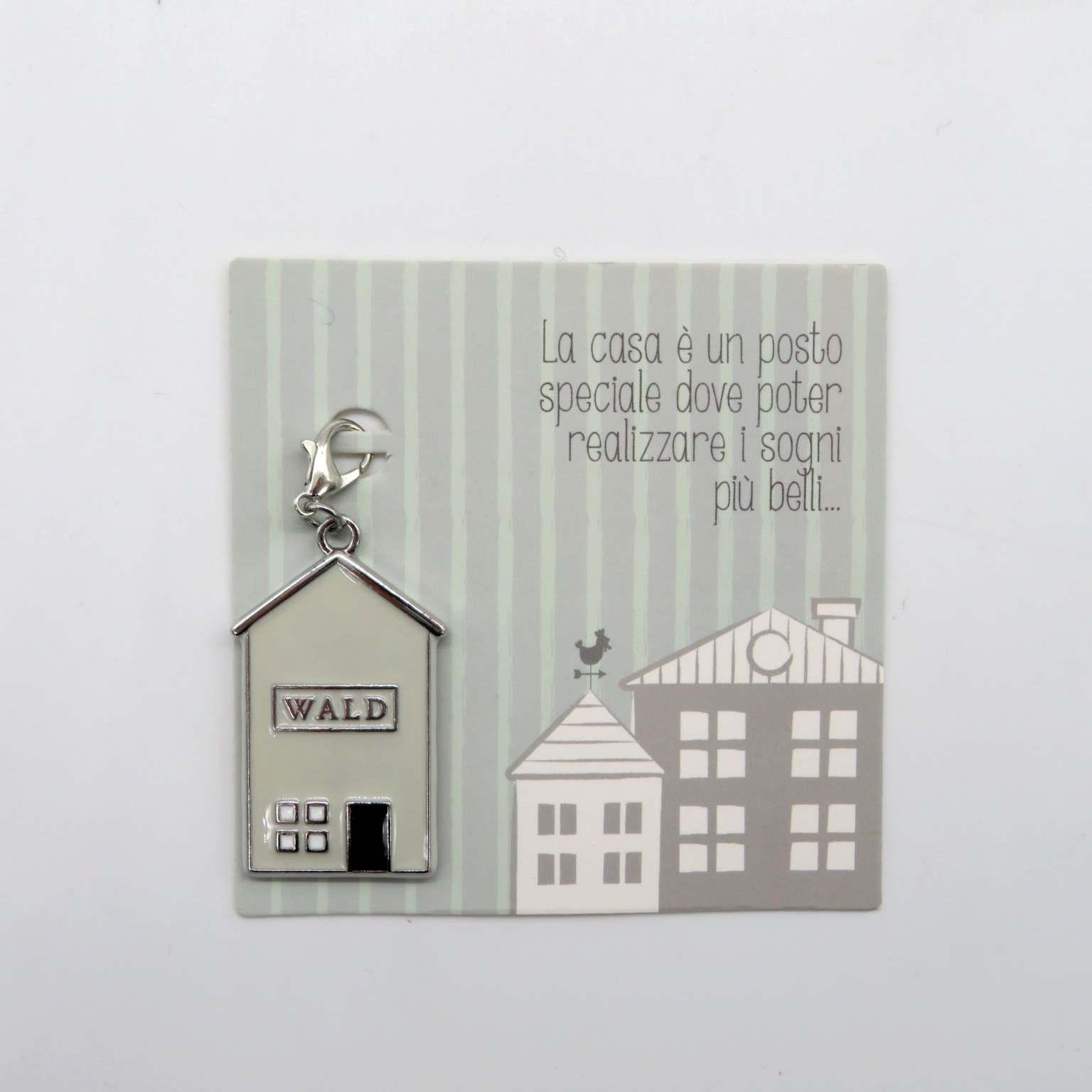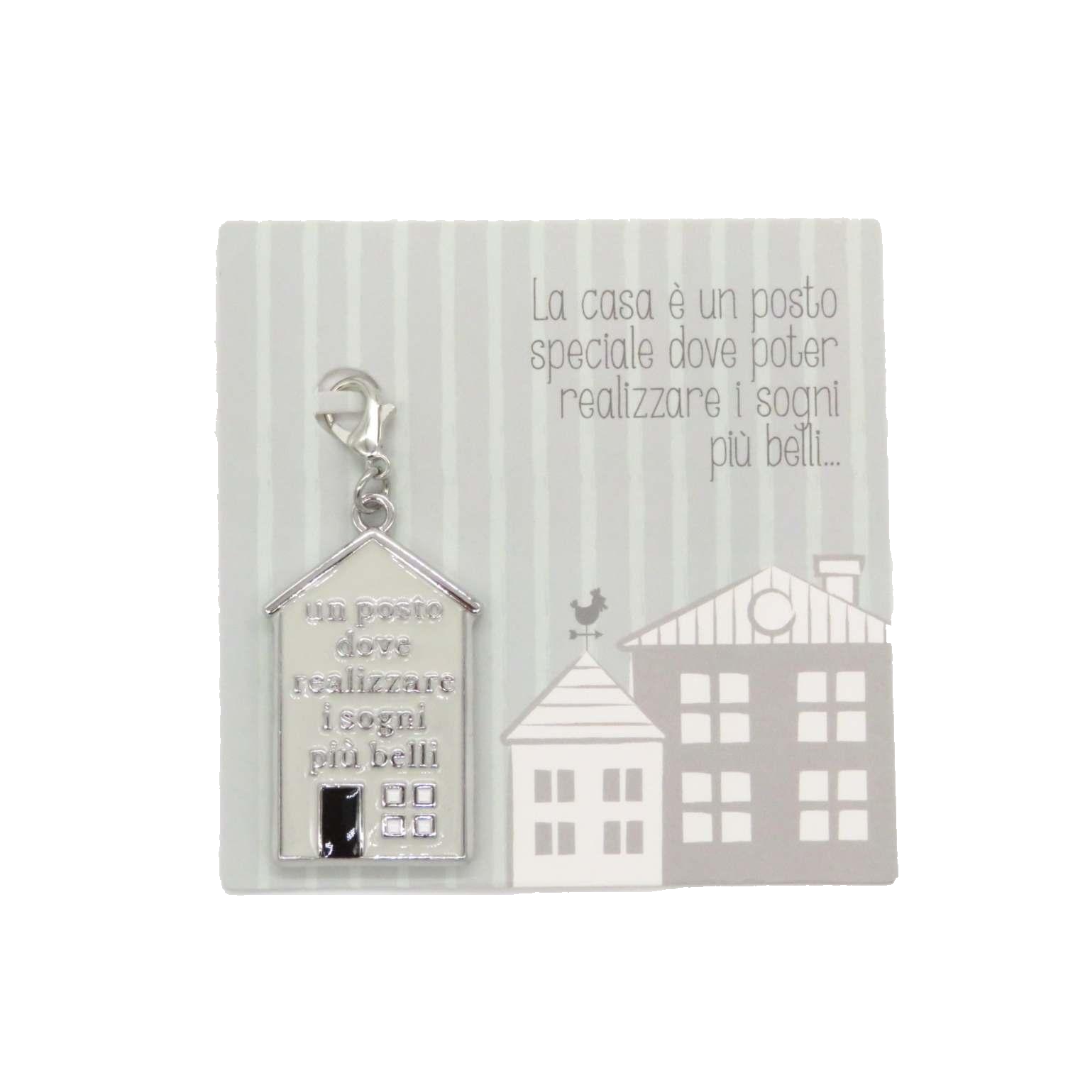 Charm, placchetta con gancetto in metallo anallergico con smalto colorato, rappresentante una casa e la frase 'un posto dove realizzare i sogni più belli.' Il charm si può appendere ad una collana, un braccialetto, un portachiavi. Un bigliettino disegnato e la frase 'La casa è un posto speciale dove poter realizzare i sogni più belli' sono il contenitore di questo oggetto prezioso da regalare. Sul retro si può completare il regalo con una nostra dedica. DIMENSIONI: 2XH4cm