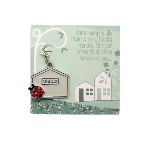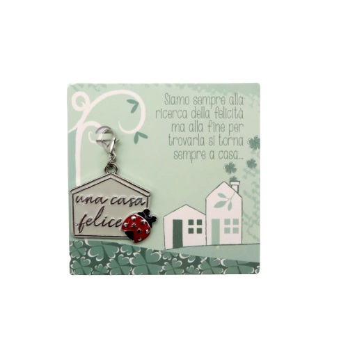 Charm, placchetta con gancetto in metallo anallergico con smalto colorato, rappresentante una casa e la frase 'una casa felice' ed una piccola coccinella sul bordo, beneaugurante. Il charm si può appendere ad una collana, un braccialetto, un portachiavi. Un bigliettino disegnato e la frase 'Siamo sempre alla ricerca della felicità ma alla fine per trovarsa si torna sempre a casa' sono il contenitore di questo oggetto prezioso da regalare. Sul retro si può completare il regalo con una nostra dedica. DIMENSIONI: 3XH3cm