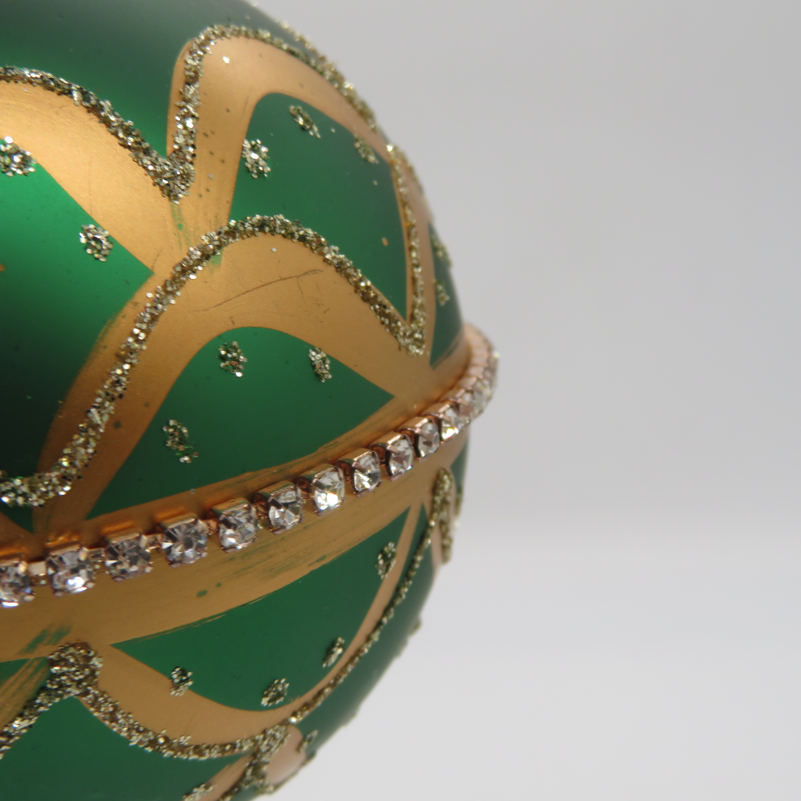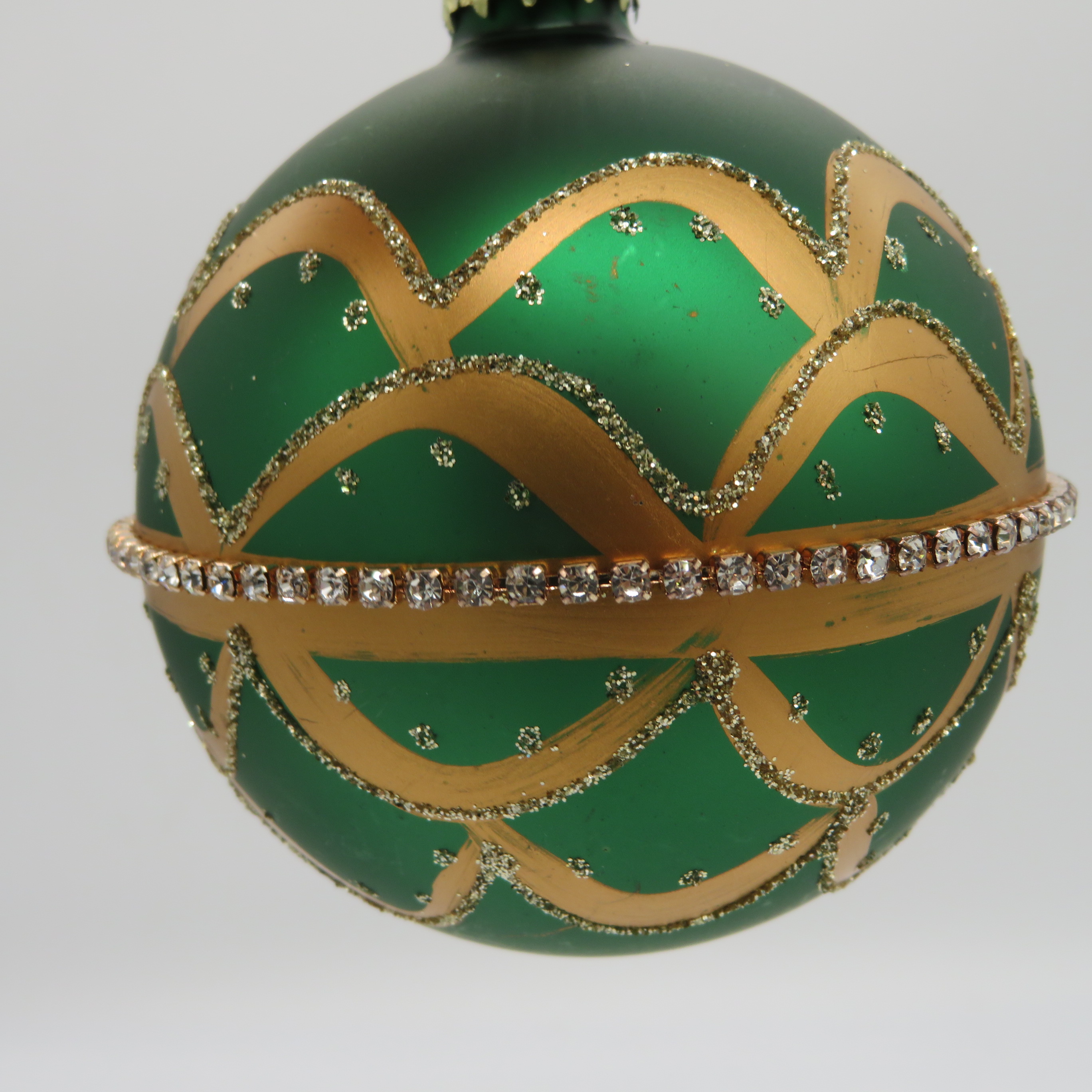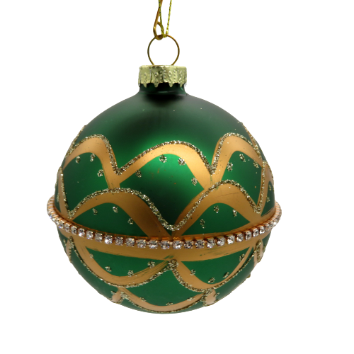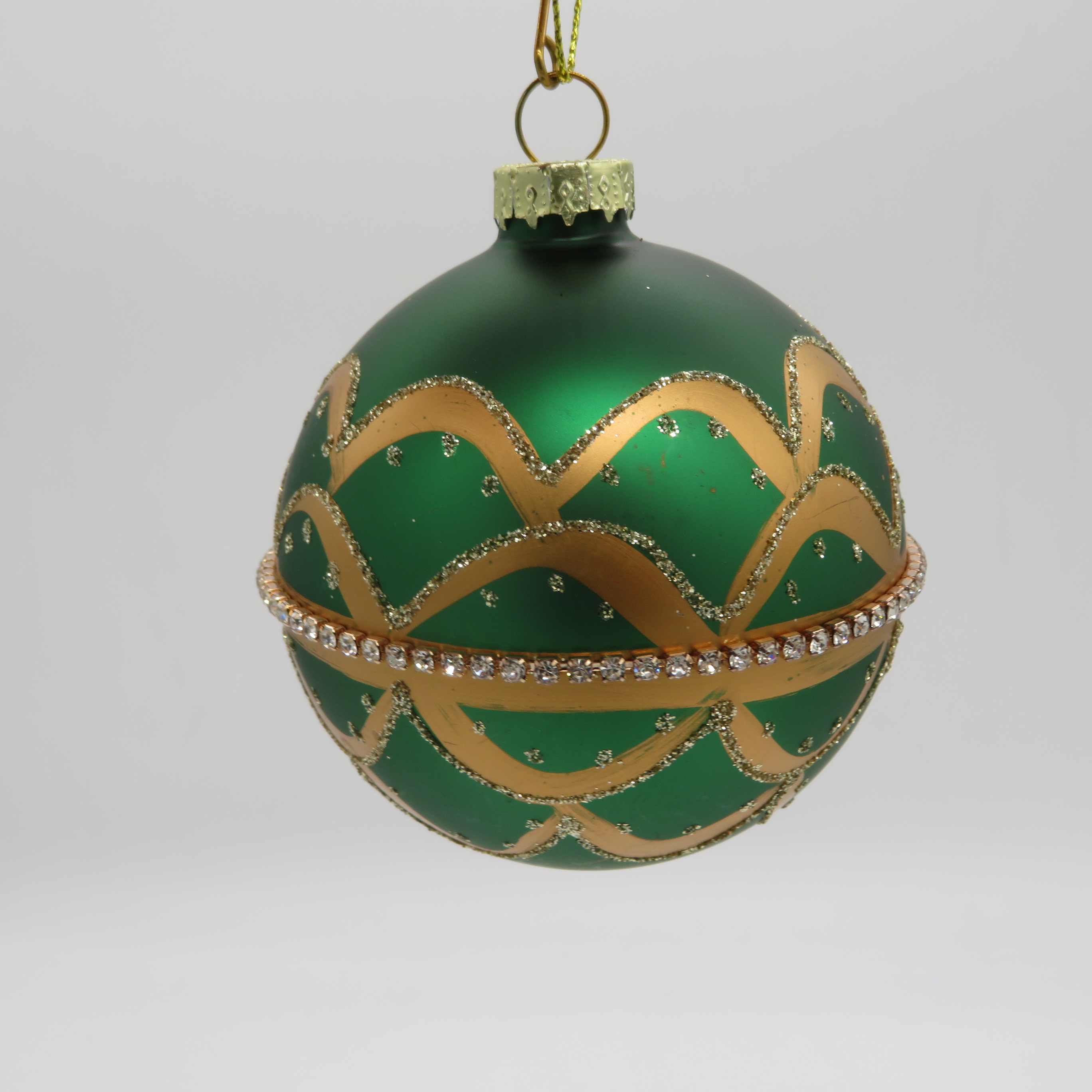 Palla in vetro rosso satinato con deborazione brillantinato oro e satinatura bianca. Diametro 8 cm