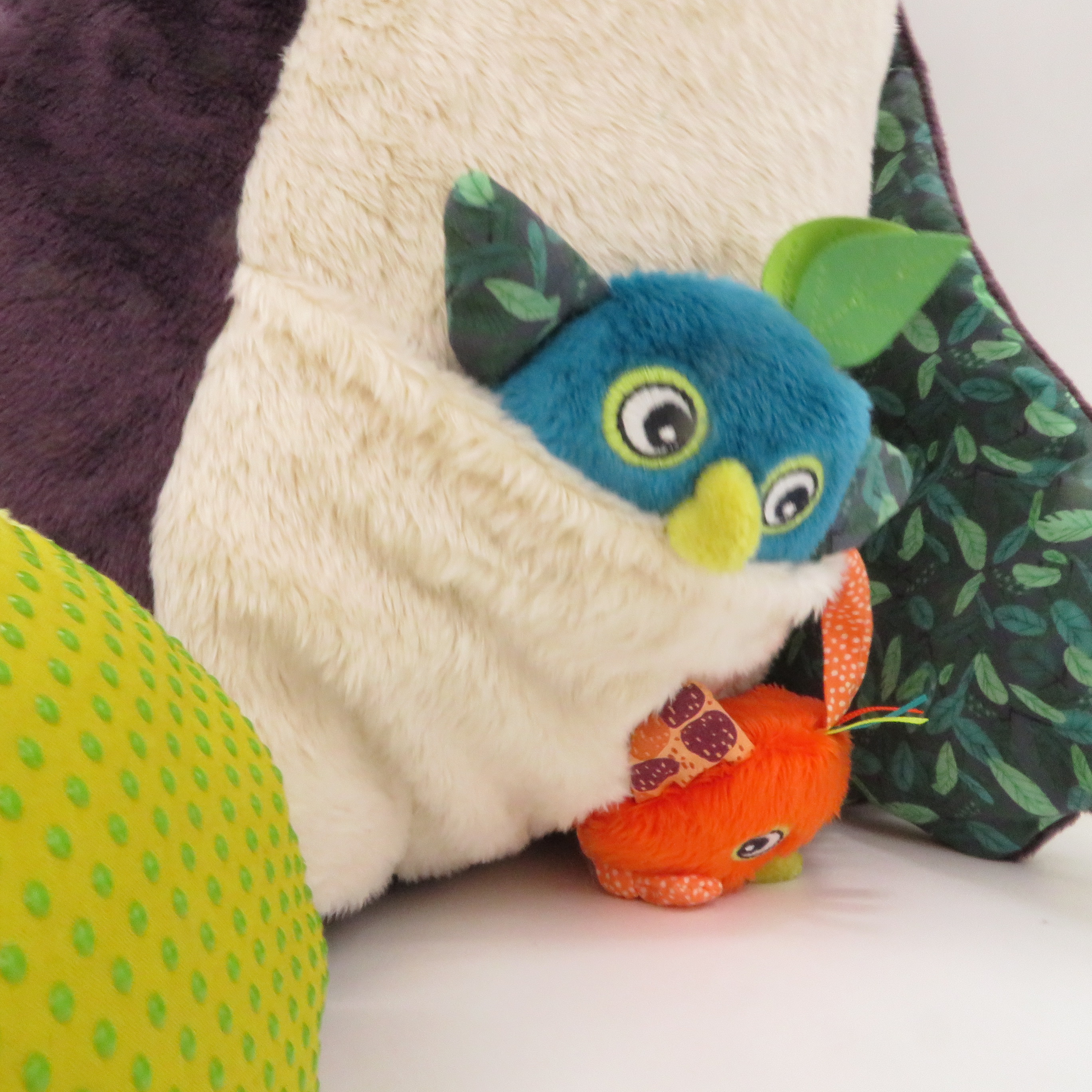 Grande Koala della linea Dans la Jungle di Moulin Roty. Il pupazzo che vorresti stringere forte al petto, morbido, colorato, simpaticissimo con quel suo nasone marroncino e il sorriso stampato.