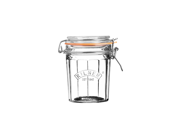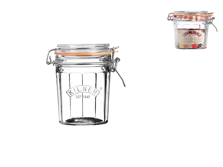 Barattolo in vetro sfacettato con apertura a cerniera e guarnizione in gomma, adatto alla conservazione di pasta, cereali, frutta secca ecc. Prodotto da Kilner UK. Capacità 0,95lt. DIMENSIONI: D11 H18cm