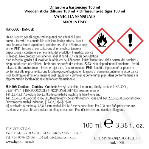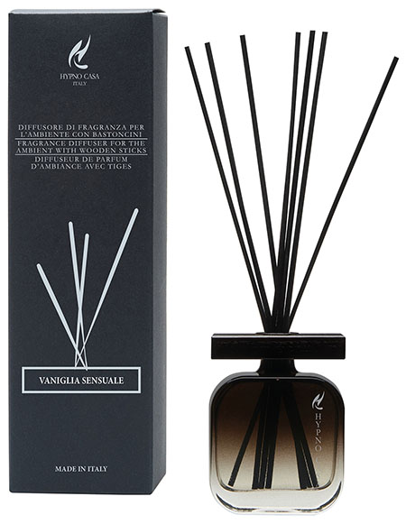 Profumatore ambiente moderno in vetro sfumato nero, con bastoncini neri in legno, capacità 100ml, fragranza 'rosa romantica'. Elegante scatola regalo nera.