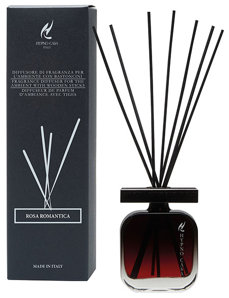 Profumatore ambiente moderno in vetro sfumato nero, con bastoncini neri in legno, capacità 100ml, fragranza vaniglia. Elegante scatola regalo nera.