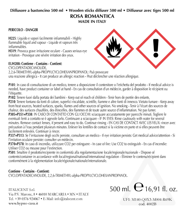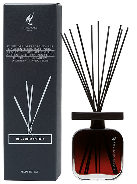 Profumatore ambiente moderno in vetro sfumato nero, con bastoncini neri in legno, capacità 500ml, fragranza 'poesia di fiori'. Elegante scatola regalo nera.