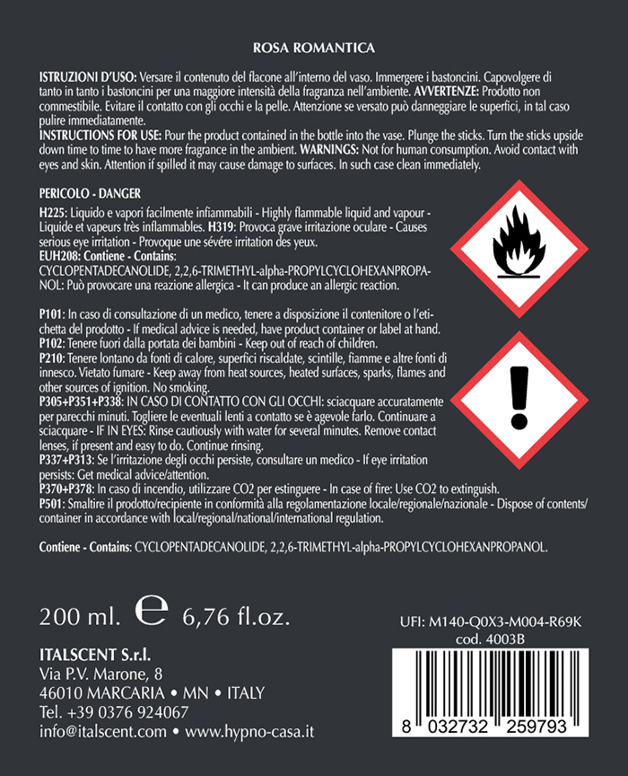 Ricarica di fragranza ROSA ROMANTICA per diffusori di profumo a bastoncino, 200ml, descrizione olfattiva Fiorita-Legnosa, colore rosa. Versare il contenuto del flacone all'interno del contenitore, immergere i bastoncini-fiore; mentre il fiore assorbe il profumo da se', i bastoncini debbono essere girati ogni qualche giorno per sentire sempre intensamente la fragranza diffondersi nell'ambiente. DIMENSIONE barattolo: 6x4xh13,5