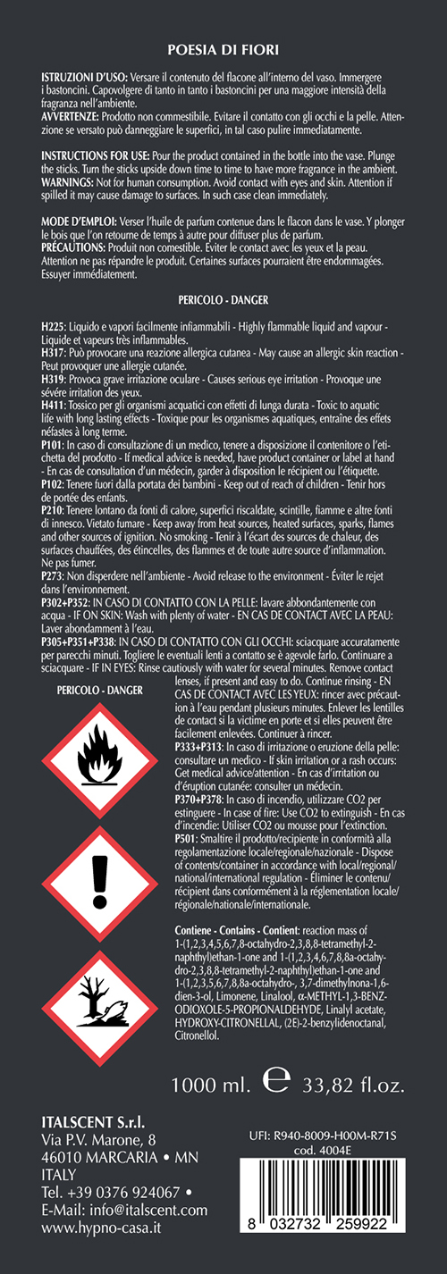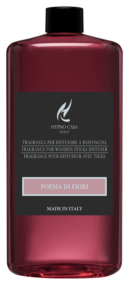 Ricarica di fragranza POESIA DI FIORI per diffusori di profumo a bastoncino, 1000ml, descrizione olfattiva Fiorita-Legnosa, colore rosa. Versare il contenuto del flacone all'interno del contenitore, immergere i bastoncini-fiore; mentre il fiore assorbe il profumo da se', i bastoncini debbono essere girati ogni qualche giorno per sentire sempre intensamente la fragranza diffondersi nell'ambiente.
