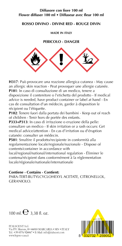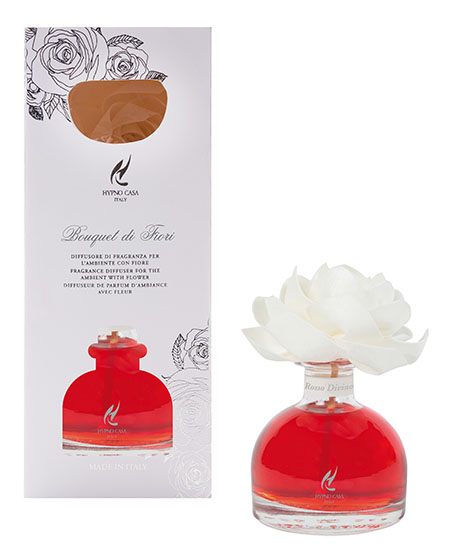 Diffusore di profumo per ambiente, con fiore in carta sostenuto da un astina in legno che si intinge nel profumo ROSSO DIVINO. La rosa diffonde il profumo con i suoi petali che ne assorbono oltre al profumo anche il colore. La capacità del contenitore è di 100ml. Il prodotto è naturale, dopo il completo assorbimento il fiore continuerà a profumare. Una volta terminato il prodotto si possono acquistare le ricariche di profumo e il fiore di carta. DIMENSIONI: D7 H9 solo contenitore, H13cm con fiore.