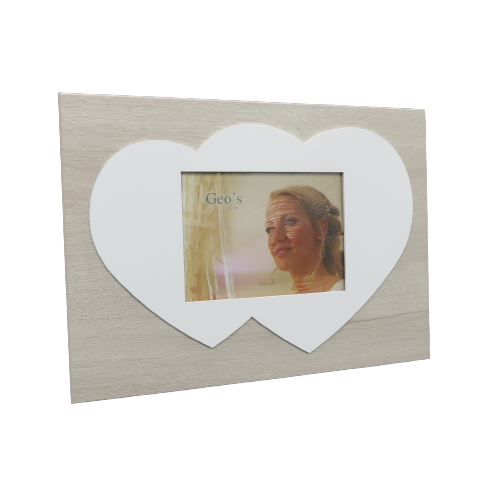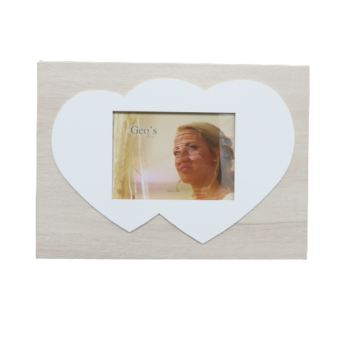 Cornice portafoto in legno rettangolare con sagoma in rilievo a forma di doppio cuore bianco, ospita fotografie orizzontali del formato 13x18. Questa cornice di fattura artigianale può esssere appesa o appoggiata al piano. Elegante scatola regalo bianca con logo. Prodotto fatto in Italia. DIMENSIONI: 40X30 profondità in appoggio 10cm, appesa 1cm