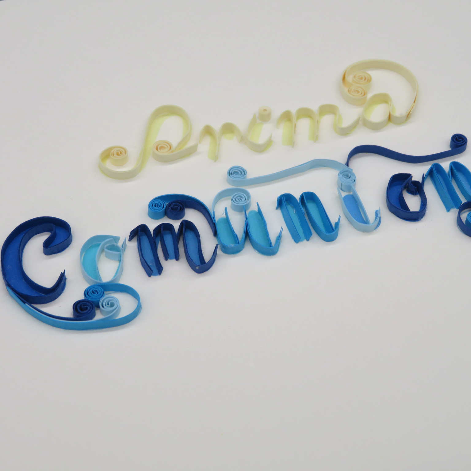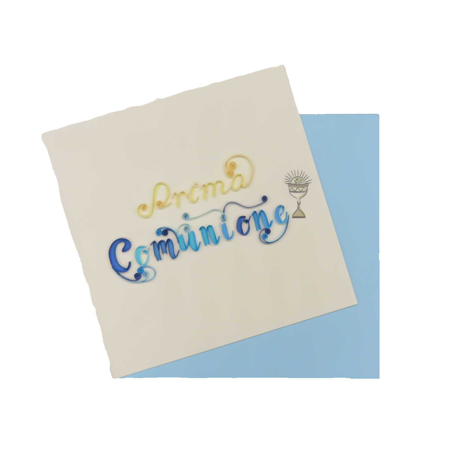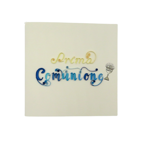 Biglietto augurale in filigrana di carta, ideati da origamo italia e costruiti con maestria nei laboratori in vietnam dove il suo titolare sostiene progetti di solidarieta con la popolazione grazie al progetto della fondazione christina noble. Il biglietto in filigrana regala emozioni, toccandolo con mano non si può non notare la manualità nell'esecuzione. Ecco il biglietto della comunione con il calice coppa. Busta color celeste. DIMENSIONI 10x10 cm