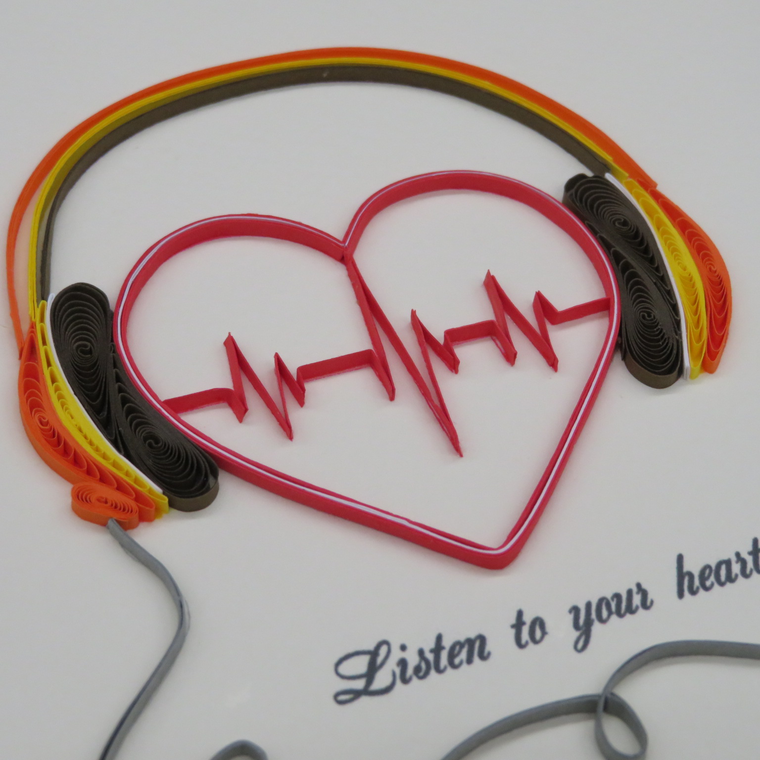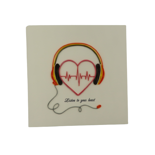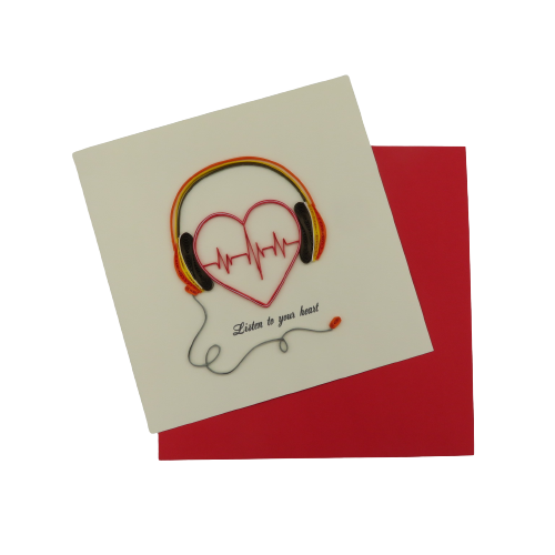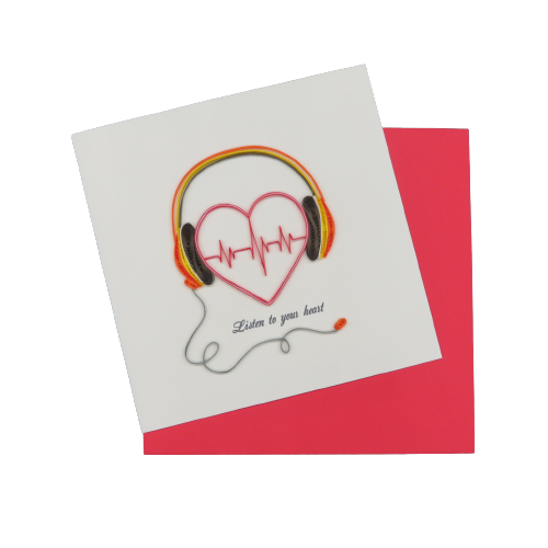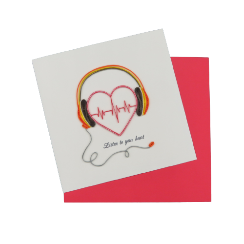 Biglietto augurale in filigrana di carta, ideati da origamo italia e costruiti con maestria nei laboratori in vietnam dove il suo titolare sostiene progetti di solidarieta con la popolazione grazie al progetto della fondazione christina noble. Il biglietto in filigrana regala emozioni, toccandolo con mano non si può non notare la manualità nell'esecuzione. Ecco il biglietto lISTEN TO YOUR HEART, ascolta le vibrazioni della musica in cuffia, busta color rosso. DIMENSIONI 10x10 cm